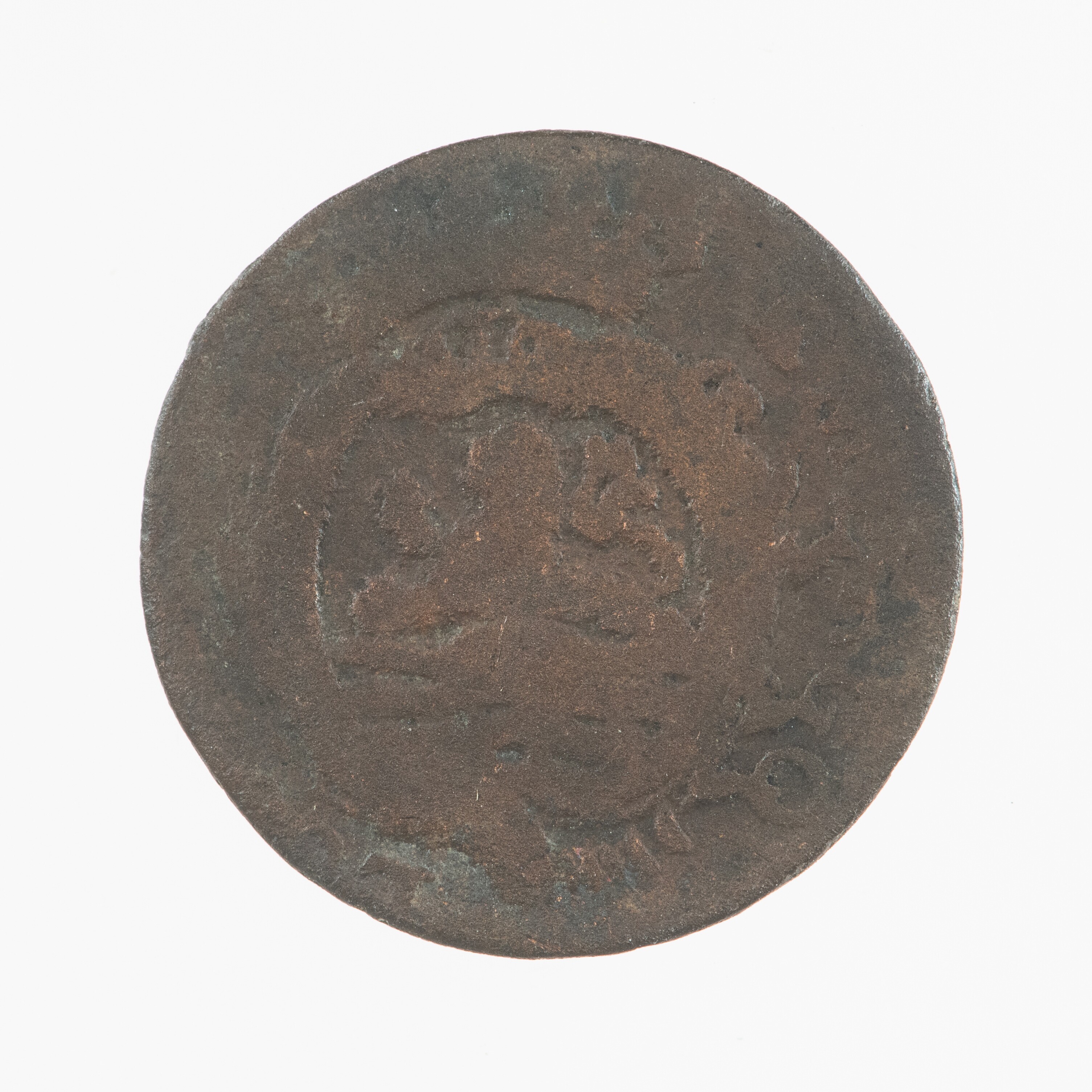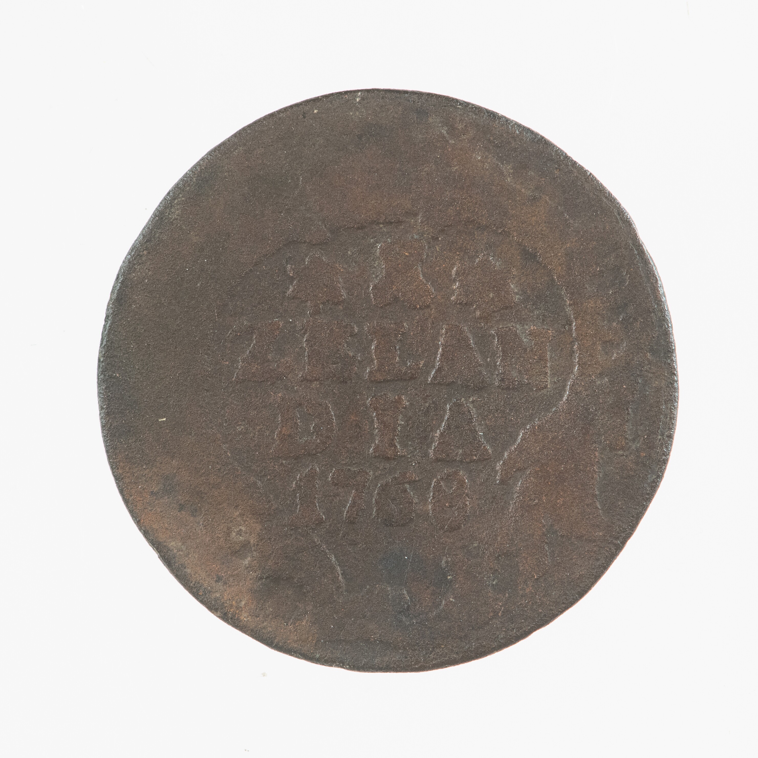 Duit; Zeeland Provincie (1581-1795); vz: in vier regels binnen rocaille-cartouche: ster (burcht) ster / ZELAN / DIA / 1768; kz: gekroond, zijdelings ingedeukt wapenschild van Zeeland, met omschrift [LUCTOR•ET•EMERGO•]; muntplaats: Middelburg; gewicht: 2.69 gram