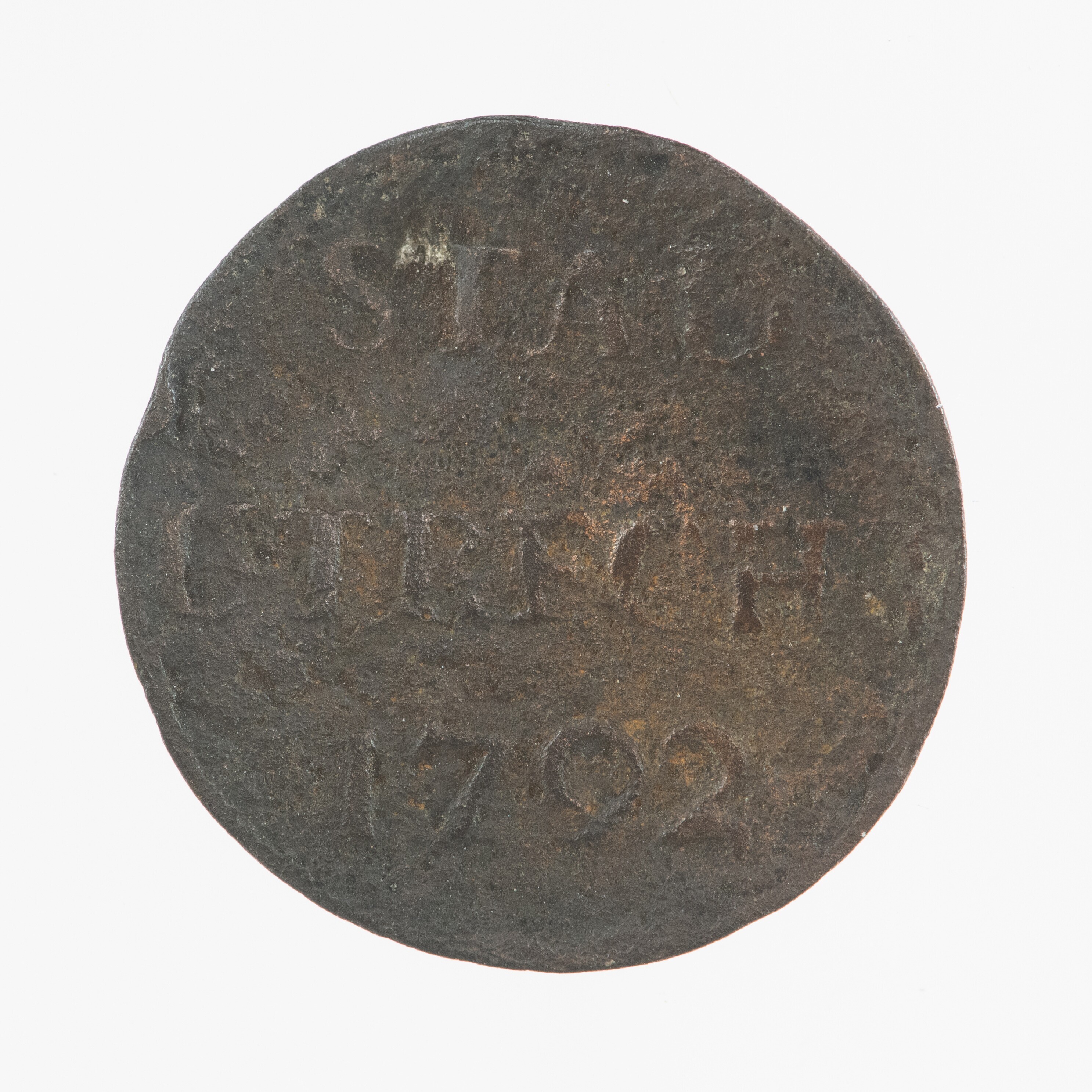 Duit; Utrecht Stad (1581-1795); vz.: in drie regels: STAD / UTRECHT / 1792; kz.: stadswapen van Utrecht met kroon, het wapen en de kroon worden vastgehouden door twee leeuwen; muntplaats: Utrecht; gewicht: 1.92 gram