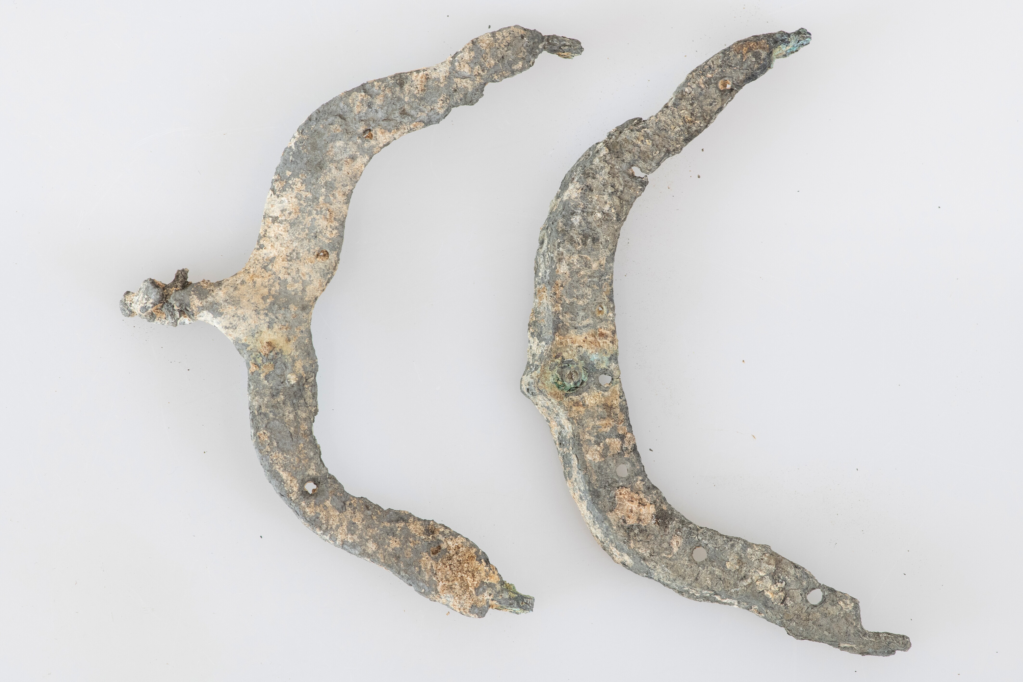 Tasbeugel; tweedelig gewelfde rand; ophangoog aan de bovenzijde met resten van een ring; bevestigingsoogjes onderkant en zijkant