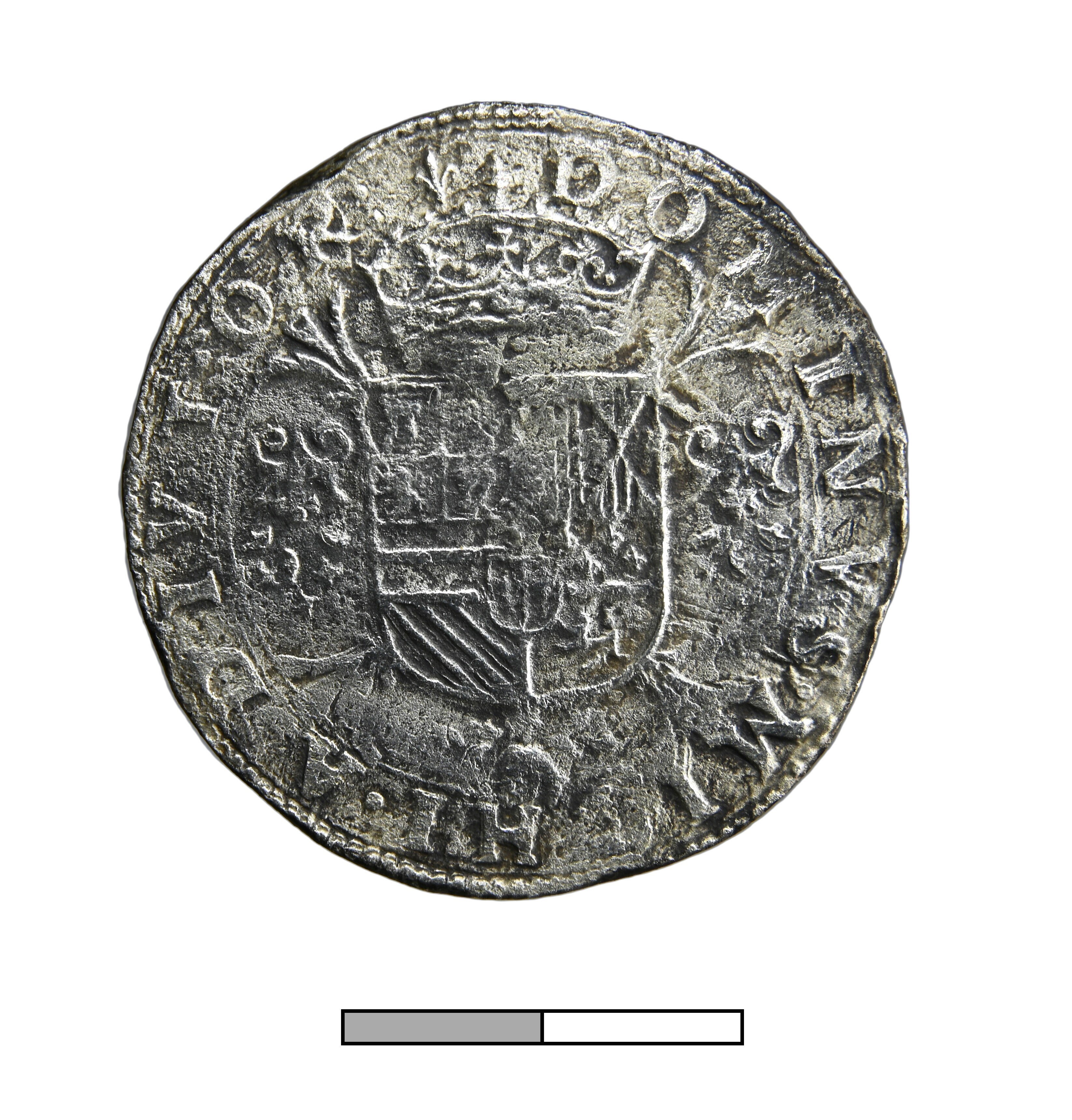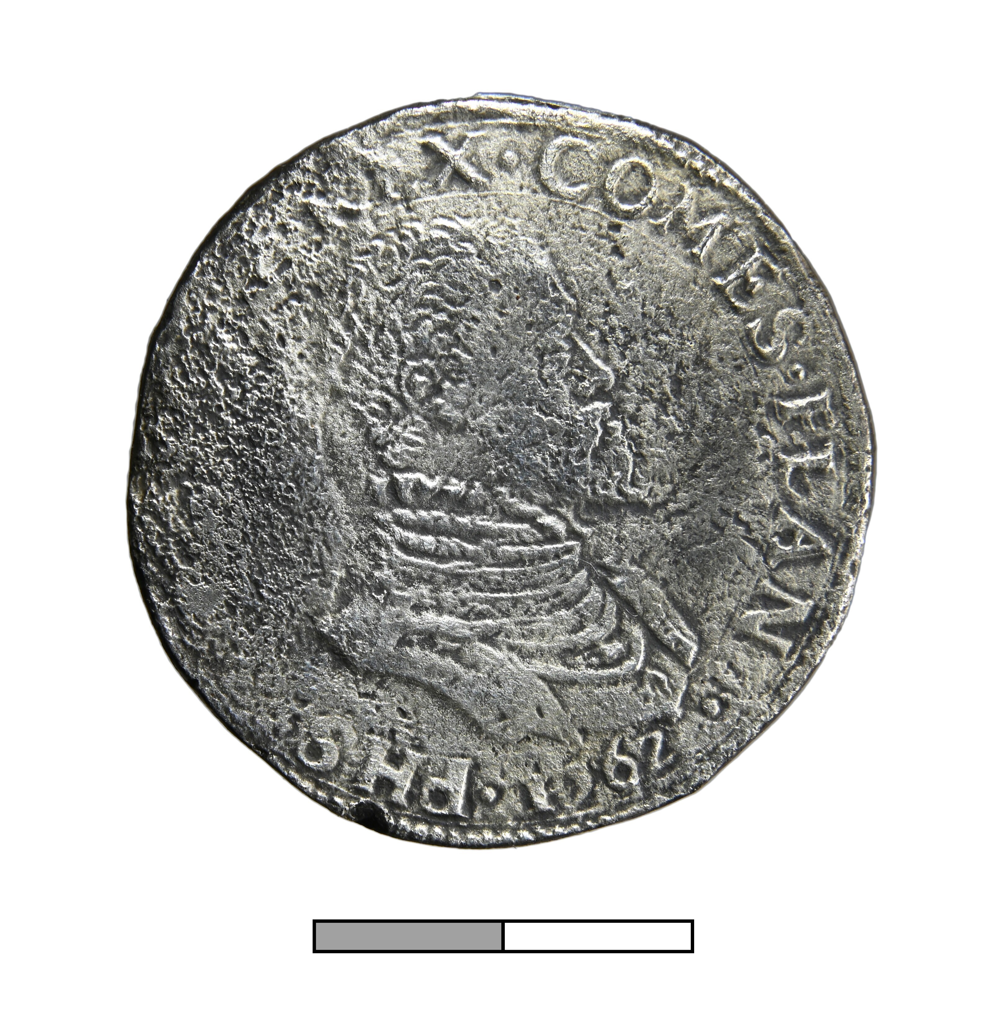 Philipsdaalder; Vlaanderen Graafschap (862-1795); Philips II (1555-1581); vz.: geharnast borstbeeld van Philips II naar rechts, met omschrift PHS•D:G•HISP•REX•COMES•FLAN•1562; kz.: gekroond wapenschild op stokkenkruis, met omschrift •DOMINVS•MI-HI•ADIVT•O:R:(lelie); muntteken: lelie; muntplaats: Brugge; gewicht: 29.05 gram; zeldzaamheid R1; referentie: vHoudt 266.BG.1562