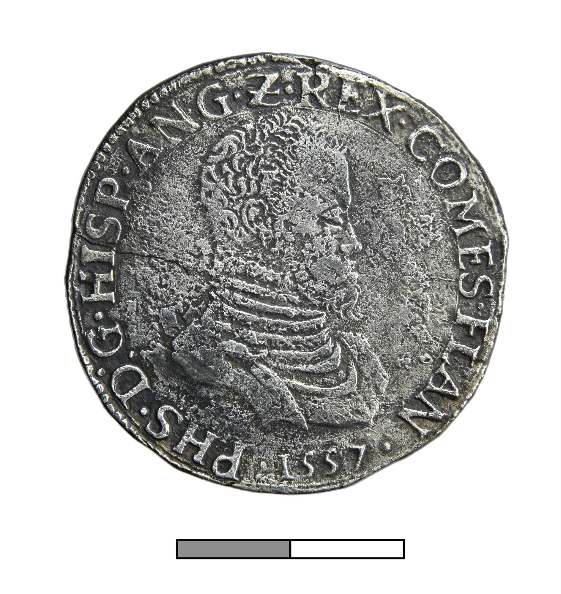 Philipsdaalder; Vlaanderen Graafschap (862-1795); Philips II (1555-1581); vz.: geharnast borstbeeld van Philips II naar rechts, met omschrift PHS•D:G•HISP•ANG•?•REX•COMES•FLAN•1557; kz.: gekroond wapenschild op stokkenkruis, met omschrift •DOMINVS•MI-HI•ADIVTOR•; muntteken: lelie; muntplaats: Brugge; gewicht: 32.1 gram; zeldzaamheid R2; referentie: vHoudt 253.BG.1557