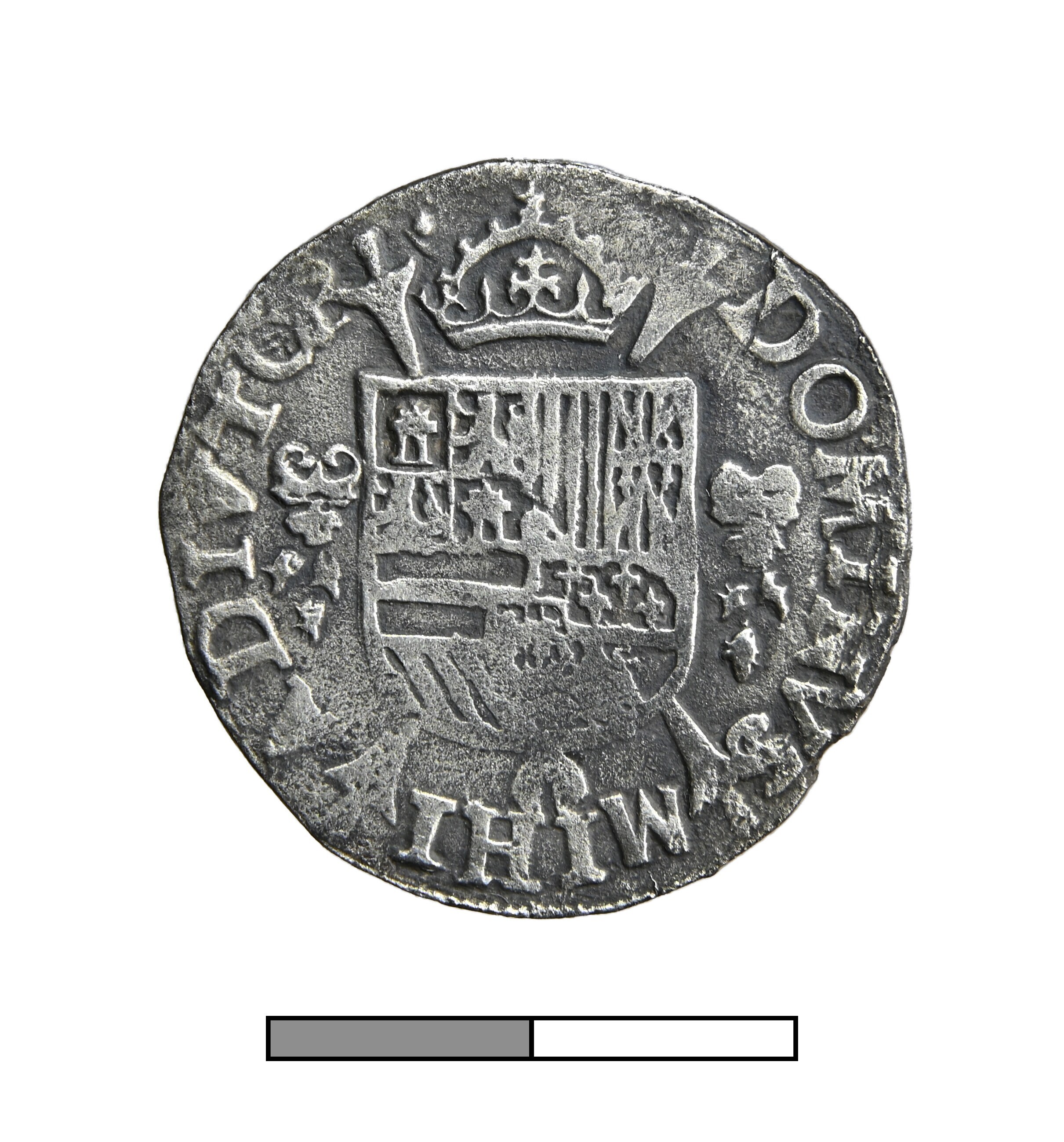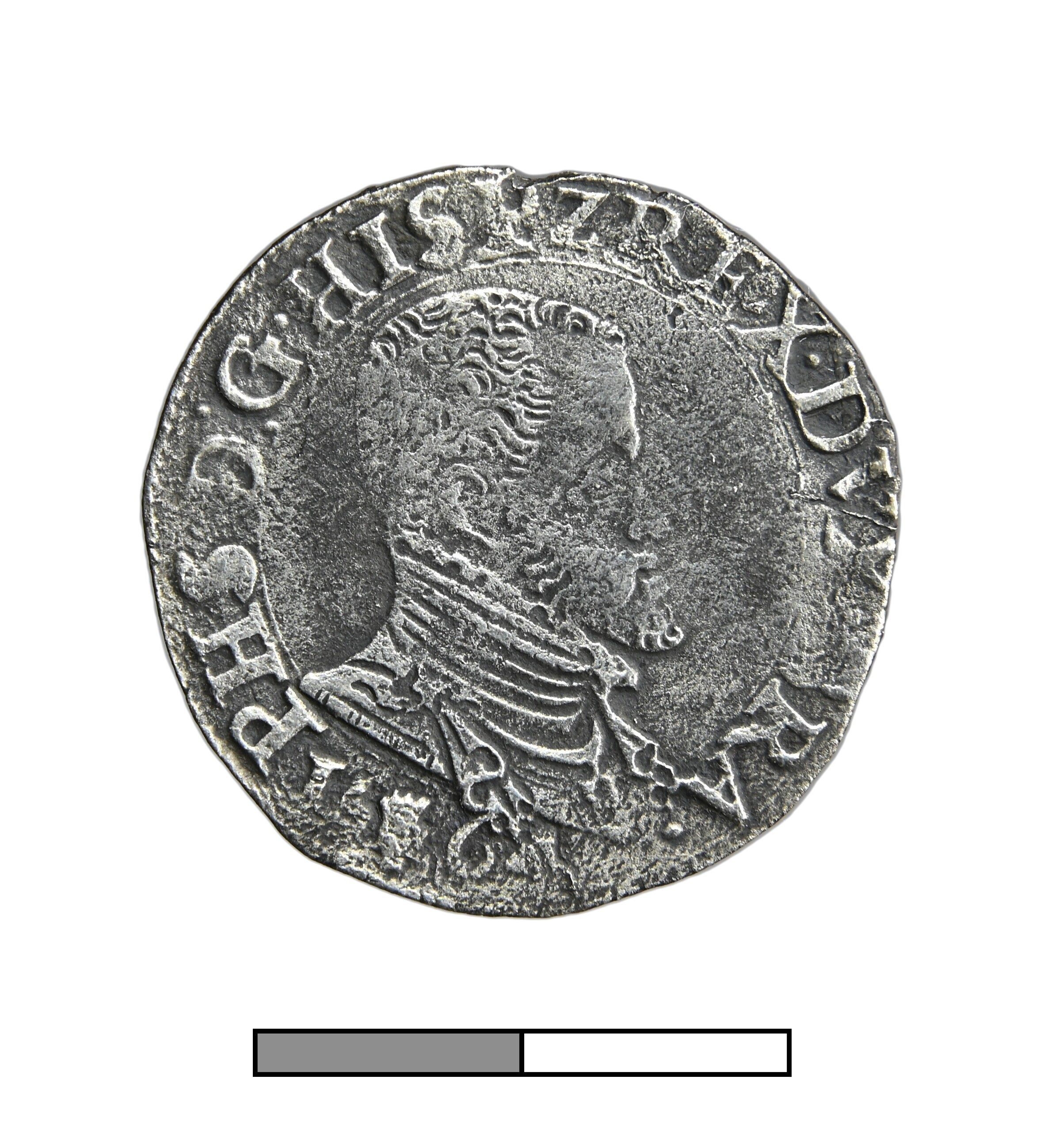 1/5 Philipsdaalder; Brabant Hertogdom (1183-1795); Philips II (1555-1581); vz.: geharnast borstbeeld van Philips II naar rechts, met omschrift PHS D:G•HISP Z REX•DVX BRA• 16 (hand) 64; kz.: gekroond wapenschild op stokkenkruis, met omschrift DOMINVS MIHI ADIVTOR; muntteken: hand; muntplaats: Antwerpen; gewicht: 5.7 gram; referentie: vHoudt 271.AN.1564