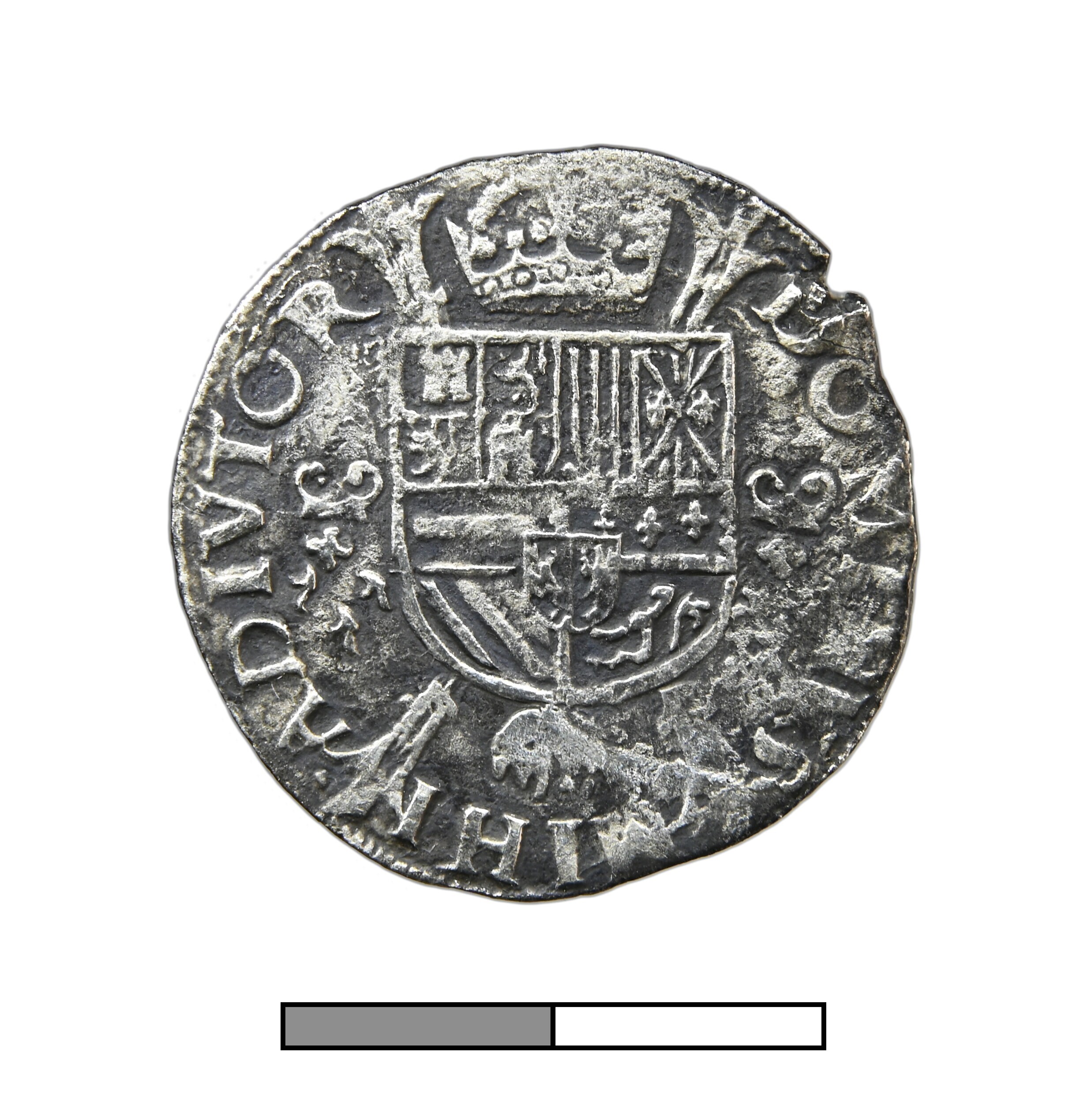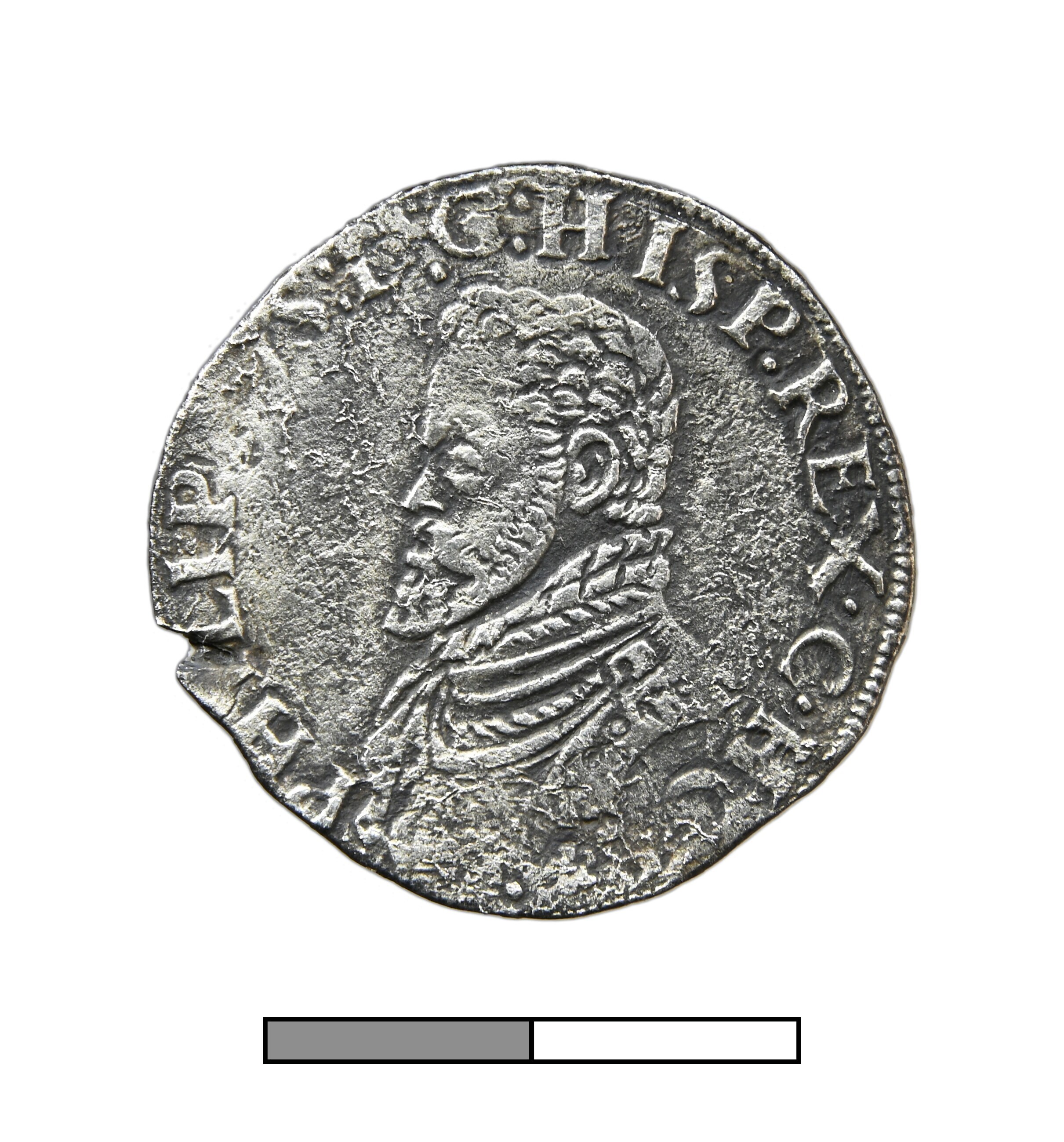 1/5 Philipsdaalder; Holland Graafschap (1049-1581); Philips II (1555-1581); vz.: geharnast borstbeeld van Philips II naar links, met omschrift PHILIPPVS:DG:HISP• REX•C•HOL?; kz.: gekroond wapenschild op stokkenkruis, met omschrift DOMINVS MIHI ADIVTOR; muntteken: roos; muntplaats: Dordrecht; gewicht: 5.45 gram; referentie: vHoudt 269.DO.zj