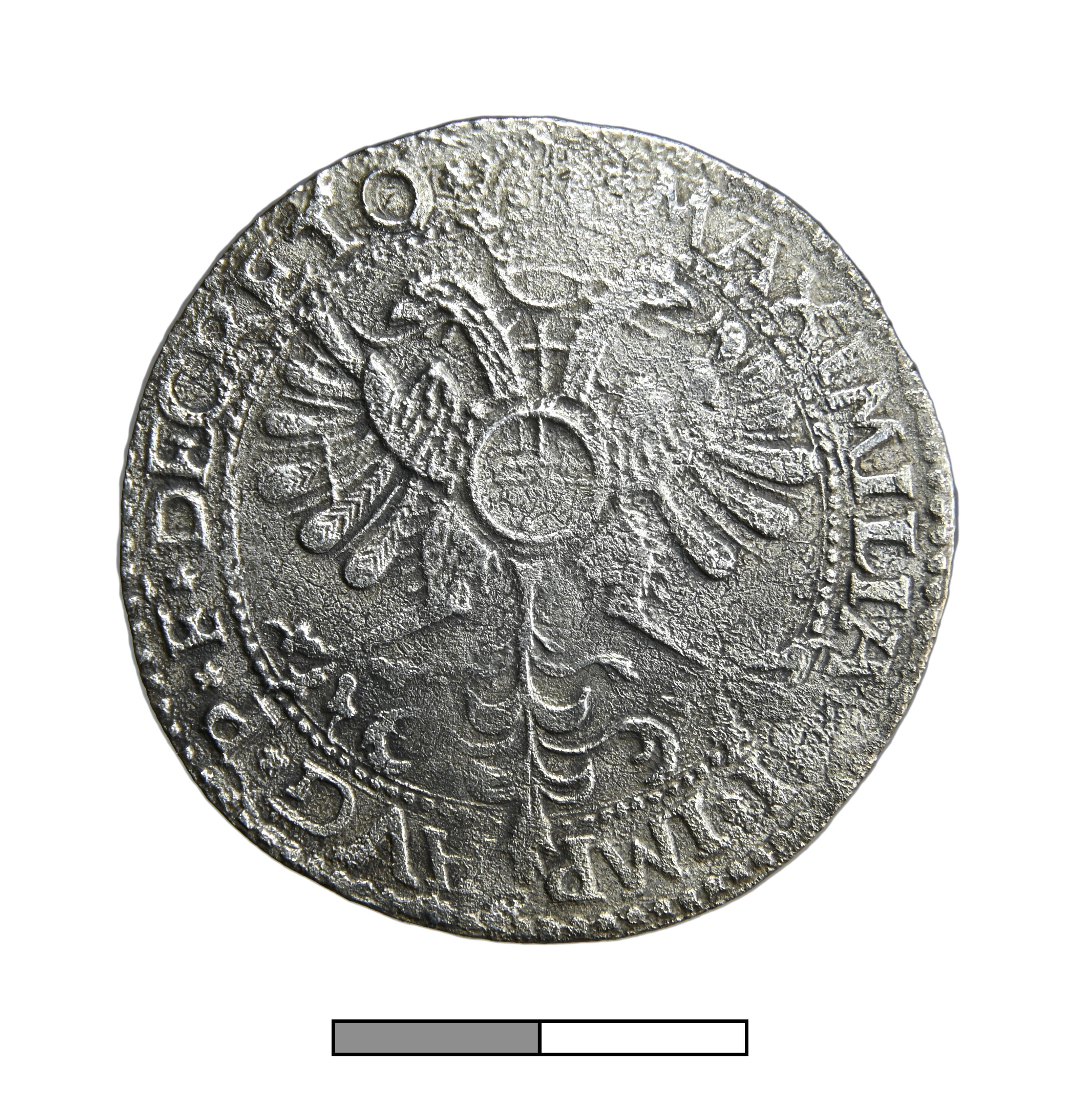 Reichsthaler; stad Keulen; Maximiliaan II (1564-1576); vz.: gehelmd stadwapen geflankeerd door griffioen en leeuw, met omschrift MO*NO*A - RG - CI - V* COLON 15 - 69; kz.: dubbeladelaar met centraal de rijksappel, met omschrift *MAXIMILIA*II* IMP - AVG*P*F*DECRETO*; muntplaats: Keulen; gewicht: 26.8 gram; referentie: Davenport 9155