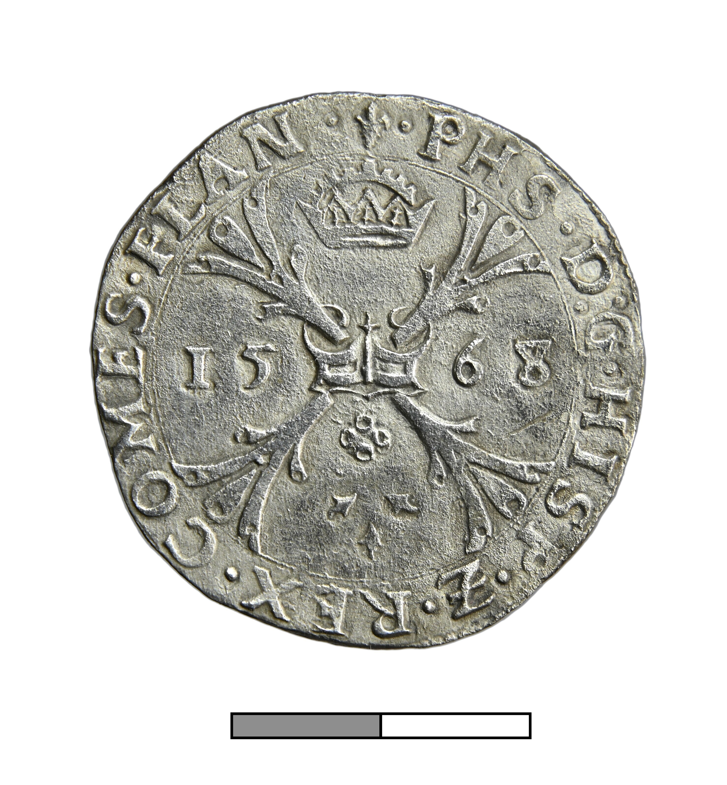 Kruisdaalder; Vlaanderen Graafschap (862-1795); Philips II (1555-1581); vz.: gekroond stokkenkruis 15-68, met omschrift •PHS•D•G•HISP•Z•REX•COMES•FLAN•(lelie); kz.: gekroond wapenschild met gulden vlies, met omschrift •DOMINVS•MI-HI•ADIVTOR•; muntteken: lelie; muntplaats: Brugge; gewicht: 27.4 gram; zeldzaamheid R1; referentie: vHoudt 290.BG.1568