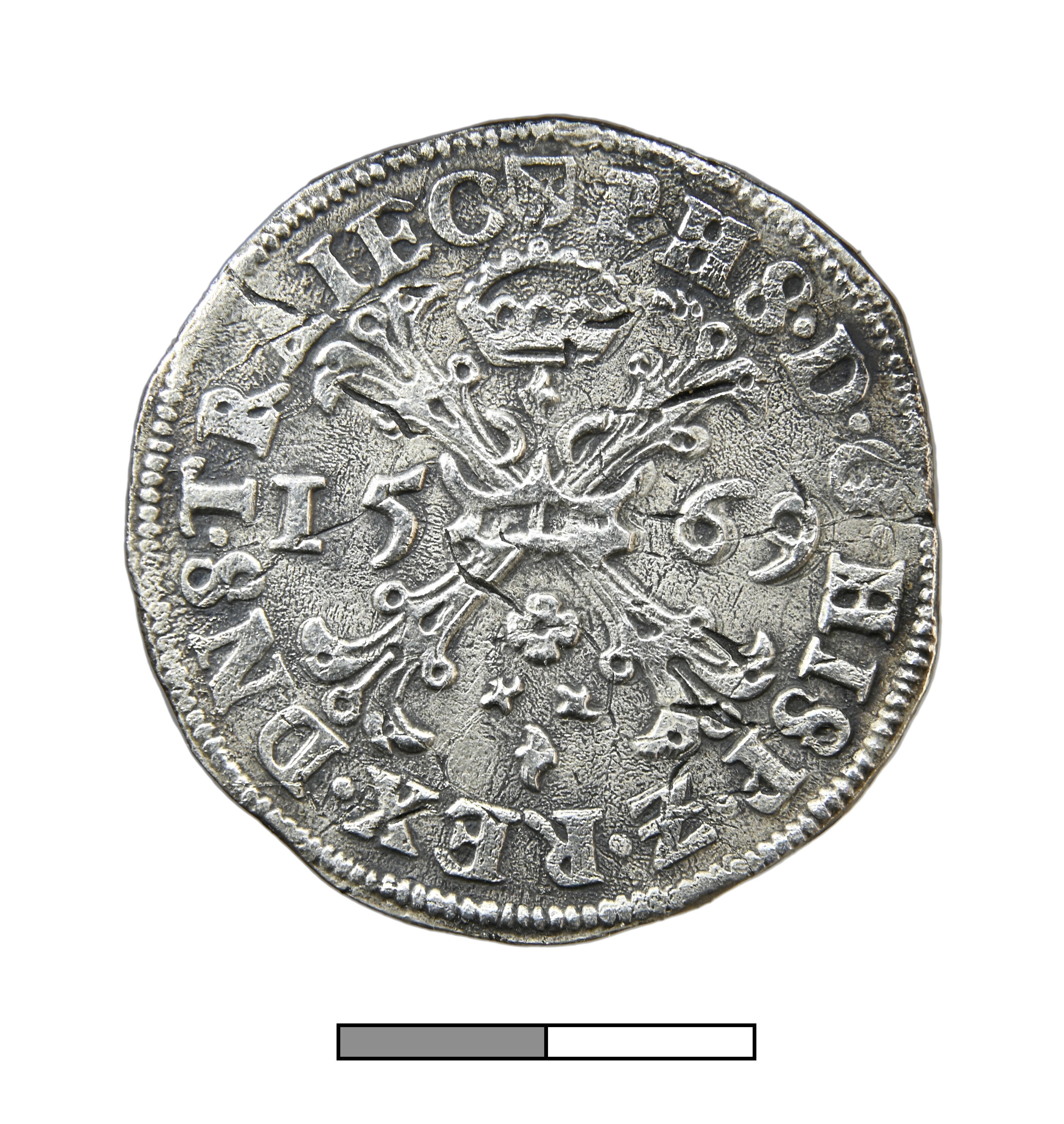 Kruisdaalder; Utrecht Heerlijkheid (1528-1581); Philips II (1555-1581); vz.: gekroond stokkenkruis 15-69, met omschrift (Utrechts wapen) PHS•D•G•HISP•Z•REX•DNS•TRAIEC; kz.: gekroond wapenschild met gulden vlies, met omschrift •DOMINVS•MI-HI•ADIVTOR•; muntteken: wapen Utrecht; muntplaats: Utrecht; gewicht: 27.35 gram; zeldzaamheid R1; referentie: vHoudt 290.UT.1569