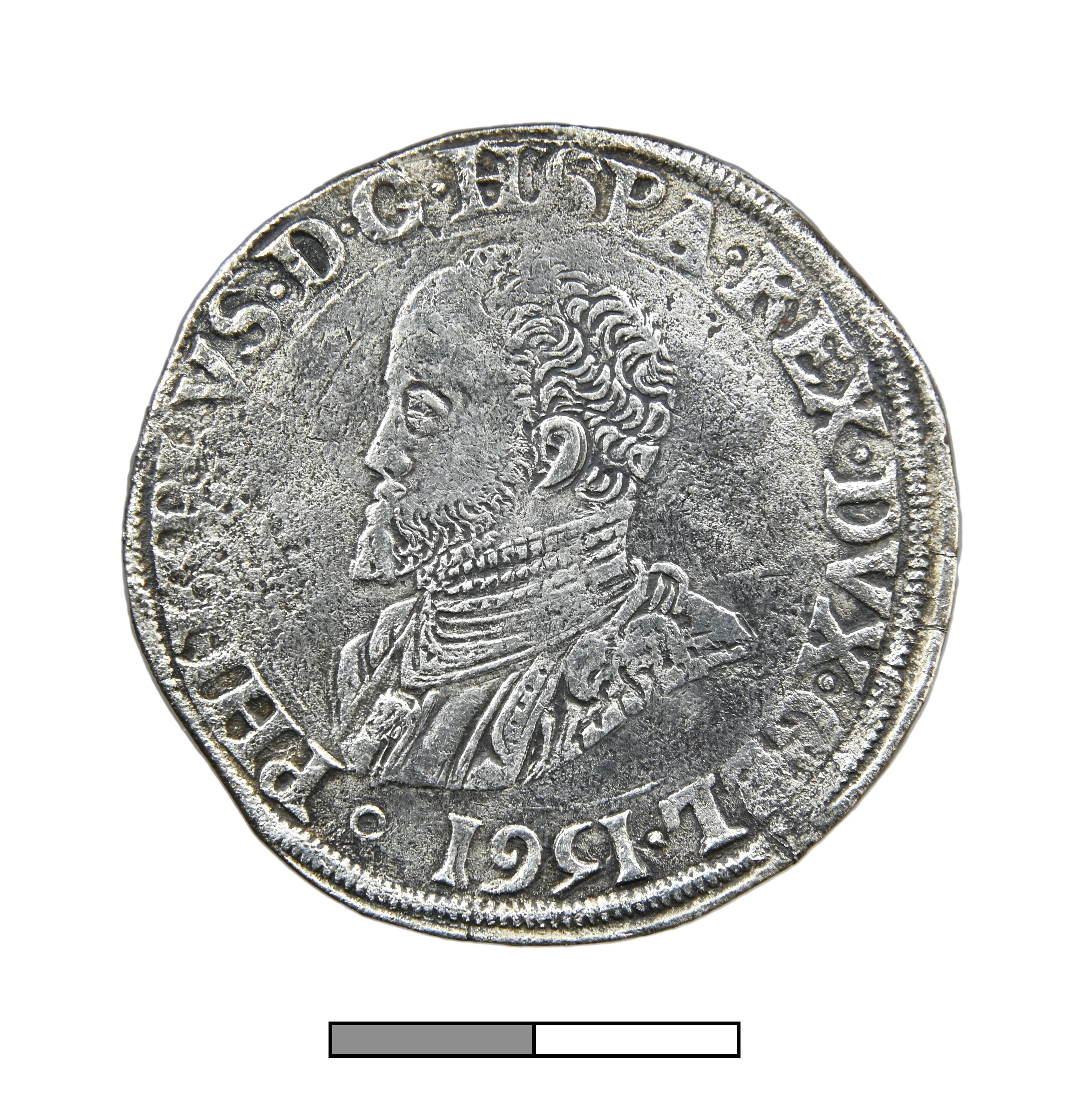 Philipsdaalder; Gelre Hertogdom (1339-1581); Philips II (1555-1581); vz.: geharnast borstbeeld van Philips II naar links, met omschrift PHILIPPVS•D•G•HSPA•REX•DVX•GEL?1561•; kz.: gekroond wapenschild op stokkenkruis, met omschrift DOMINVS•MIC - HI•ADIVTOR+; muntteken: Gelders kruis; muntplaats: Nijmegen; gewicht: 32.45 gram; zeldzaamheid 97006; referentie: vHoudt 265.NIJ.1561