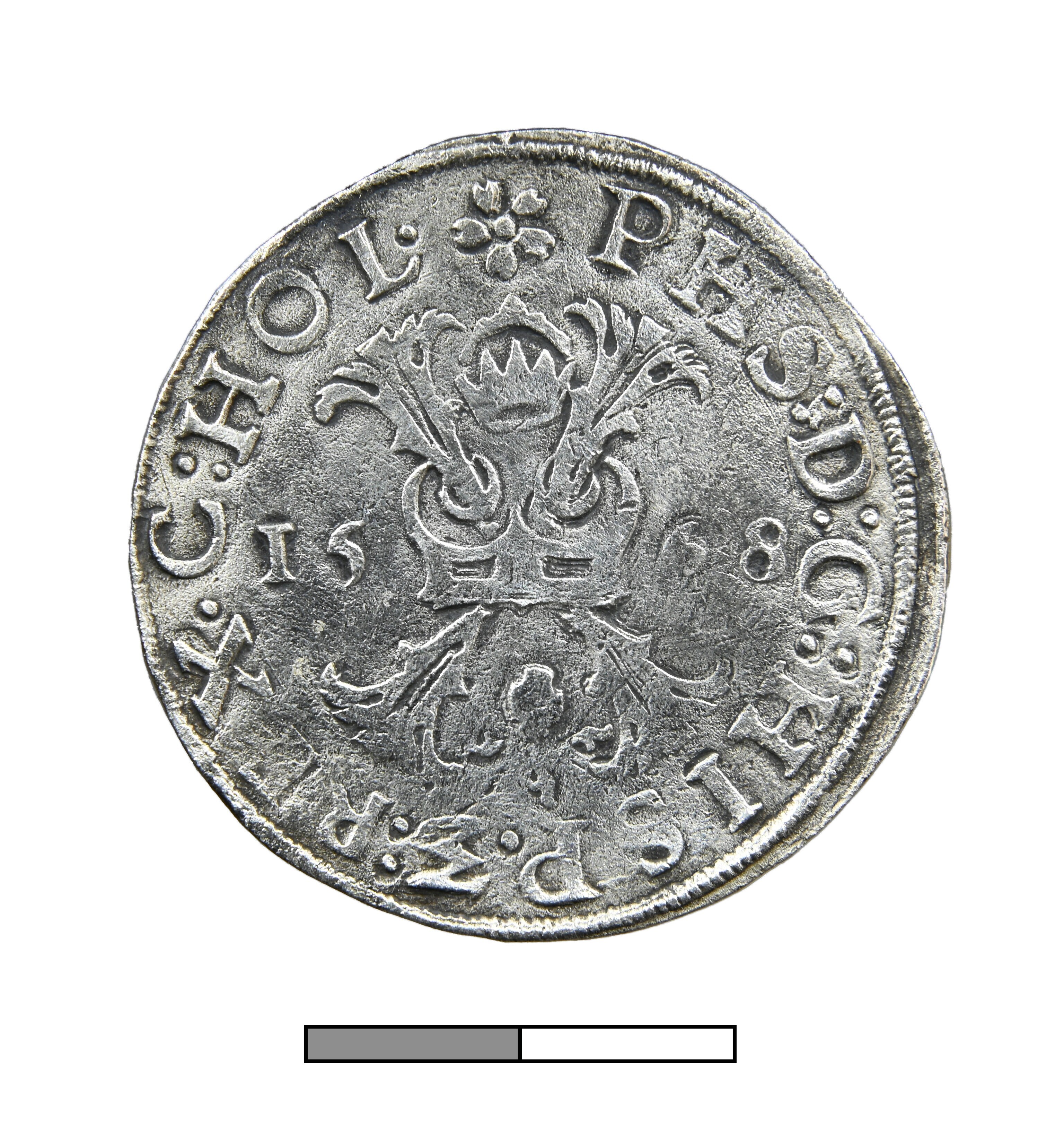 Kruisdaalder; Holland Graafschap (1049-1581); Philips II (1555-1581); vz.: gekroond stokkenkruis 15-68, met omschrift ?PHS:D:G:HISP•Z:REX•C:HOL•; kz.: gekroond wapenschild met gulden vlies, met omschrift DOMINVS•MI-HI•ADIVTOR; muntteken: roos; muntplaats: Dordrecht; gewicht: 27.1 gram; referentie: vHoudt 290.DO.1568