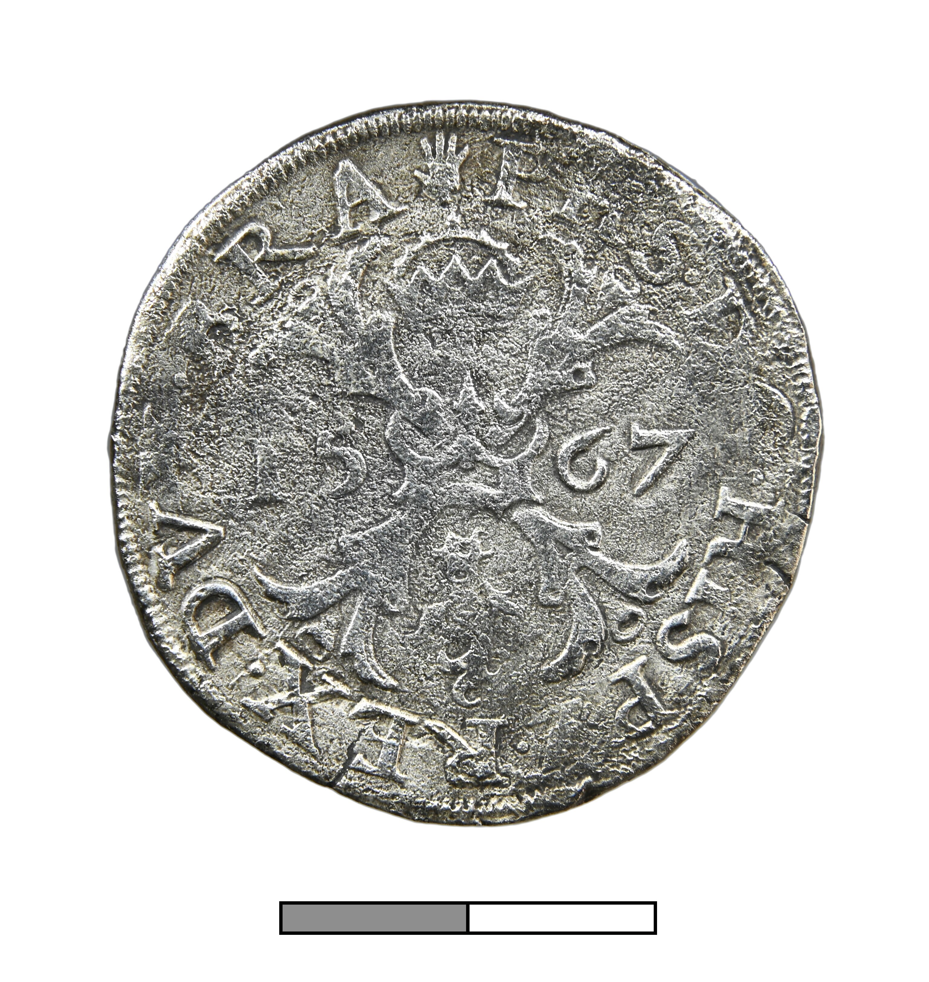Kruisdaalder; Brabant Hertogdom (1183-1795); Philips II (1555-1581); vz.: gekroond stokkenkruis 15-67, met omschrift PHS•D•G•HISP Z REX•DVX•BRA (hand); kz.: gekroond wapenschild met gulden vlies, met omschrift DOMINVS•MI-HI•ADIVTOR; muntteken: hand; muntplaats: Antwerpen; gewicht: 27 gram; referentie: vHoudt 290.AN.1567