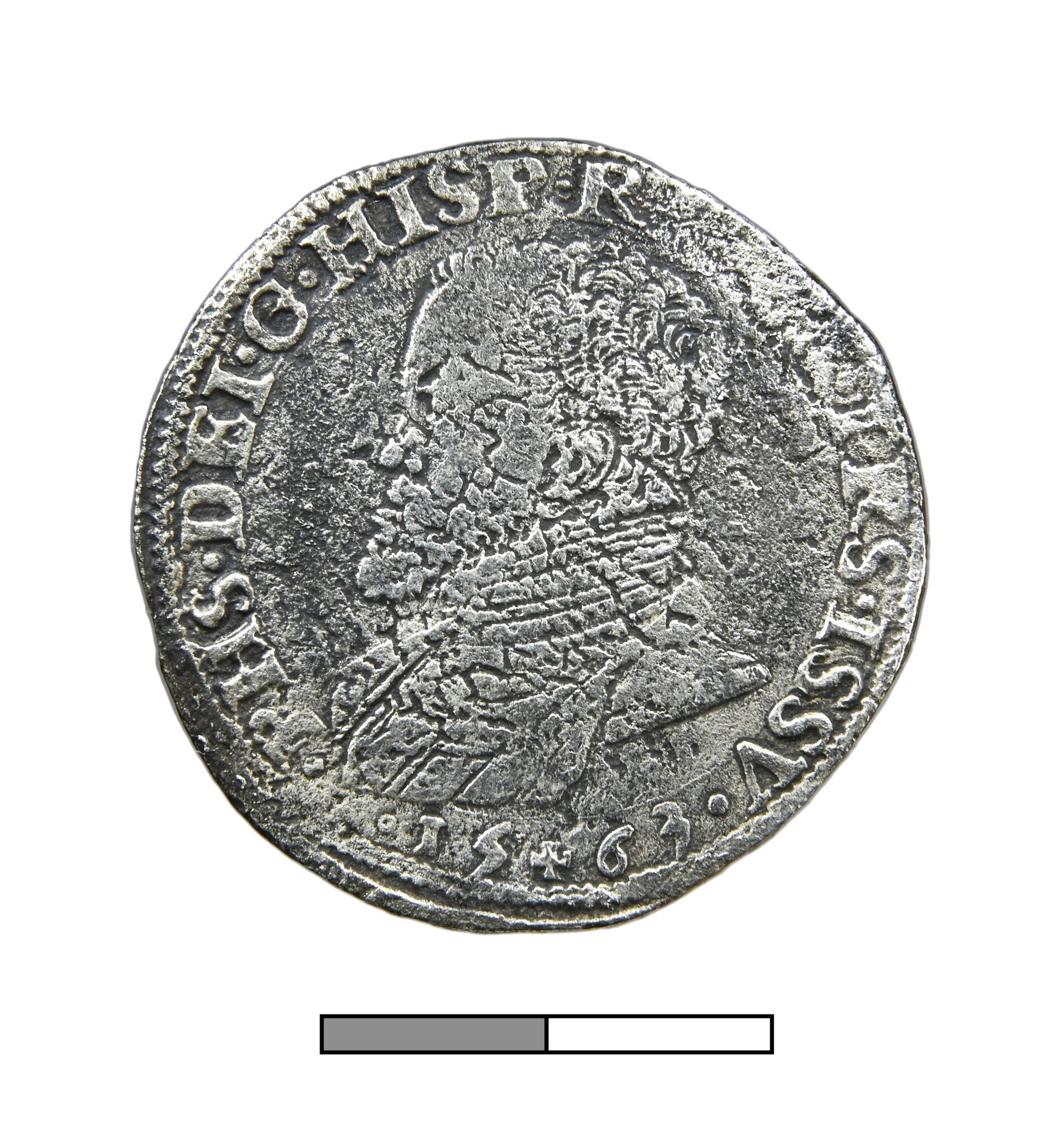 1/2 Philipsdaalder; Overijssel Heerlijkheid (1528-1581); Philips II (1555-1581); vz.: geharnast borstbeeld van Philips II naar links, met omschrift PHS•DEI•G•HISP•R[EX•D•]TRS•ISSV• 15+63; kz.: gekroond wapenschild op stokkenkruis, met omschrift •DOMINVS•MIC - HI•ADIVTOR+; muntteken: kruis; muntplaats: Hasselt; gewicht: 14.4 gram; zeldzaamheid R1; referentie: vHoudt 267.HS.1563