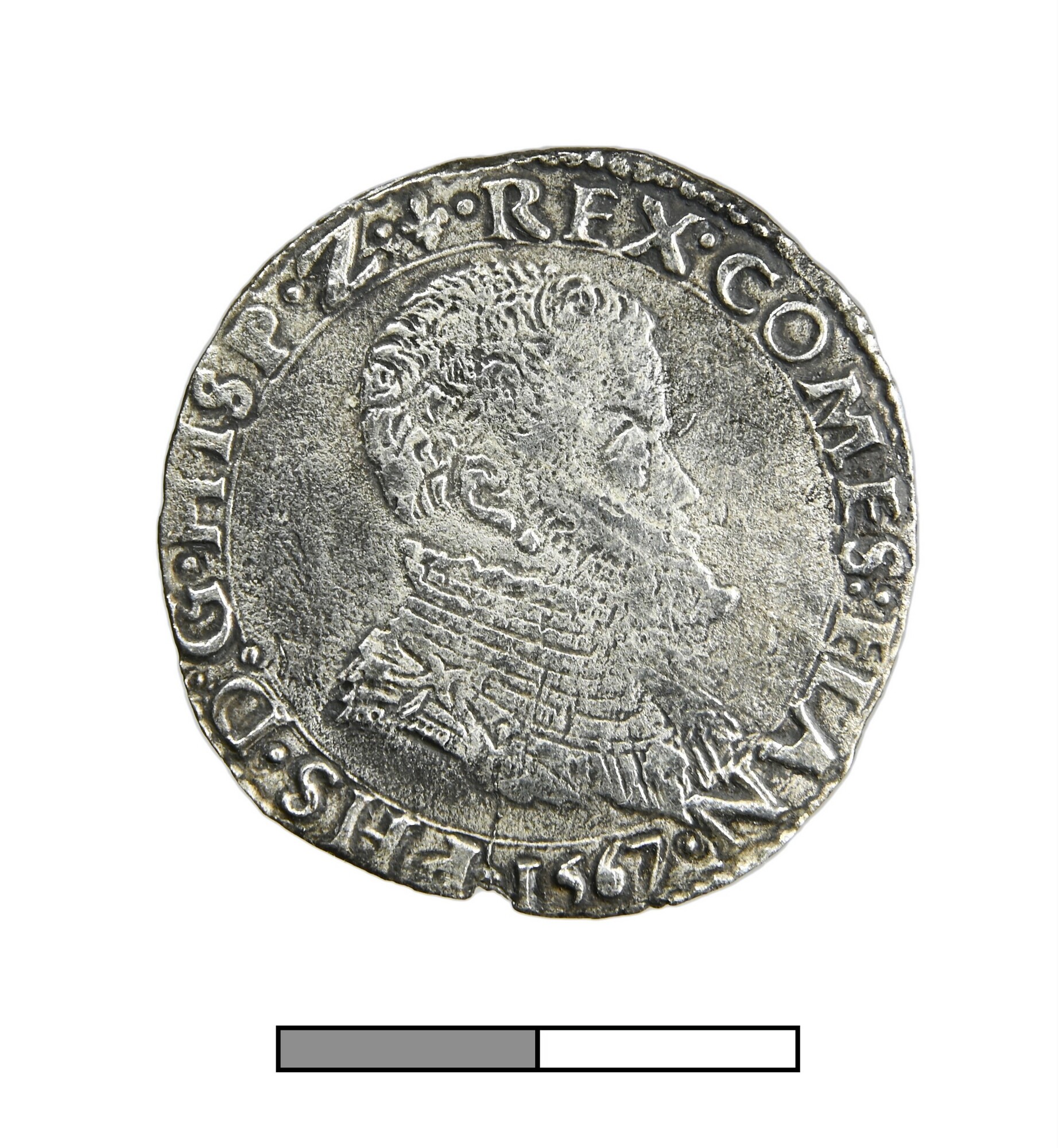 1/5 Philipsdaalder; Vlaanderen Graafschap (862-1795); Philips II (1555-1581); vz.: geharnast borstbeeld van Philips II naar rechts, met omschrift PHS•D•G•HISP•Z•(lelie)•REX•COMES:FLAN•1567; kz.: gekroond wapenschild op stokkenkruis, met omschrift •DOMINVS•MIHI•ADIVTOR•; muntteken: lelie; muntplaats: Brugge; gewicht: 5.5 gram; referentie: vHoudt 271.BG.1567
