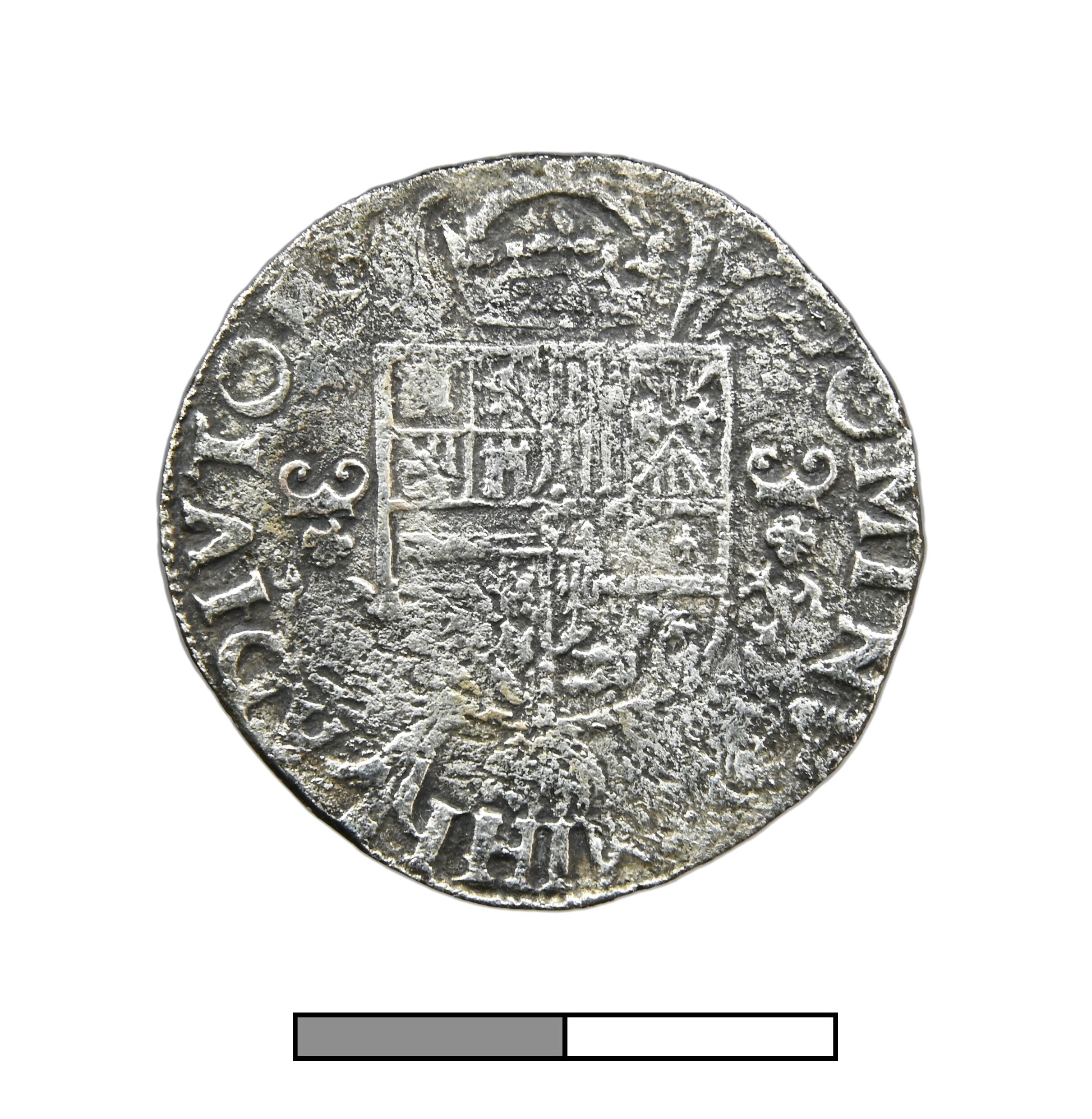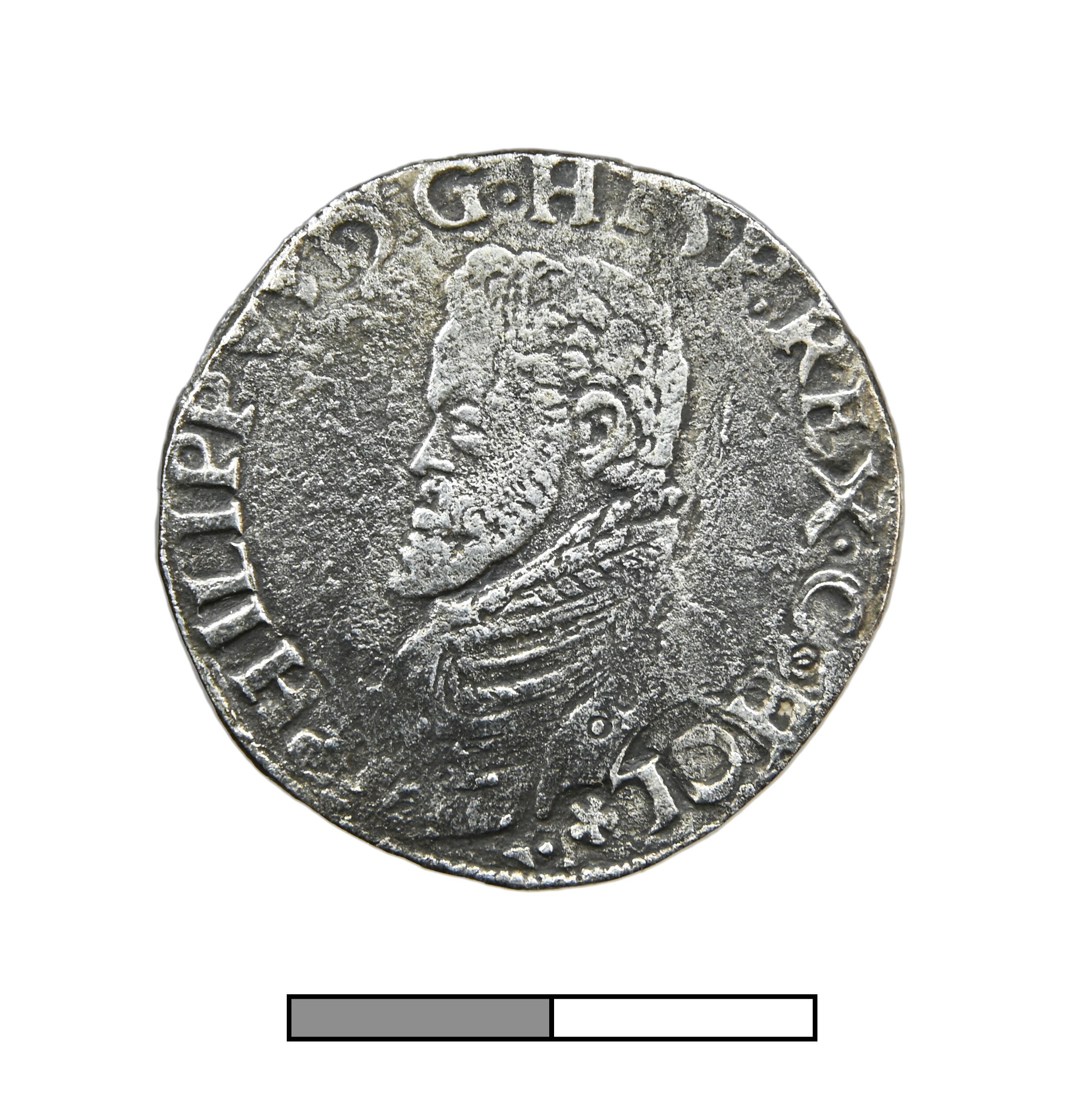1/5 Philipsdaalder; Holland Graafschap (1049-1581); Philips II (1555-1581); vz.: geharnast borstbeeld van Philips II naar links, met omschrift PHILIPPVS•DG•HISP•REX•C•HOL*; kz.: gekroond wapenschild op stokkenkruis, met omschrift DOMINVS MIHI ADIVTOR; muntteken: roos; muntplaats: Dordrecht; gewicht: 5.6 gram; referentie: vHoudt 269.DO.zj