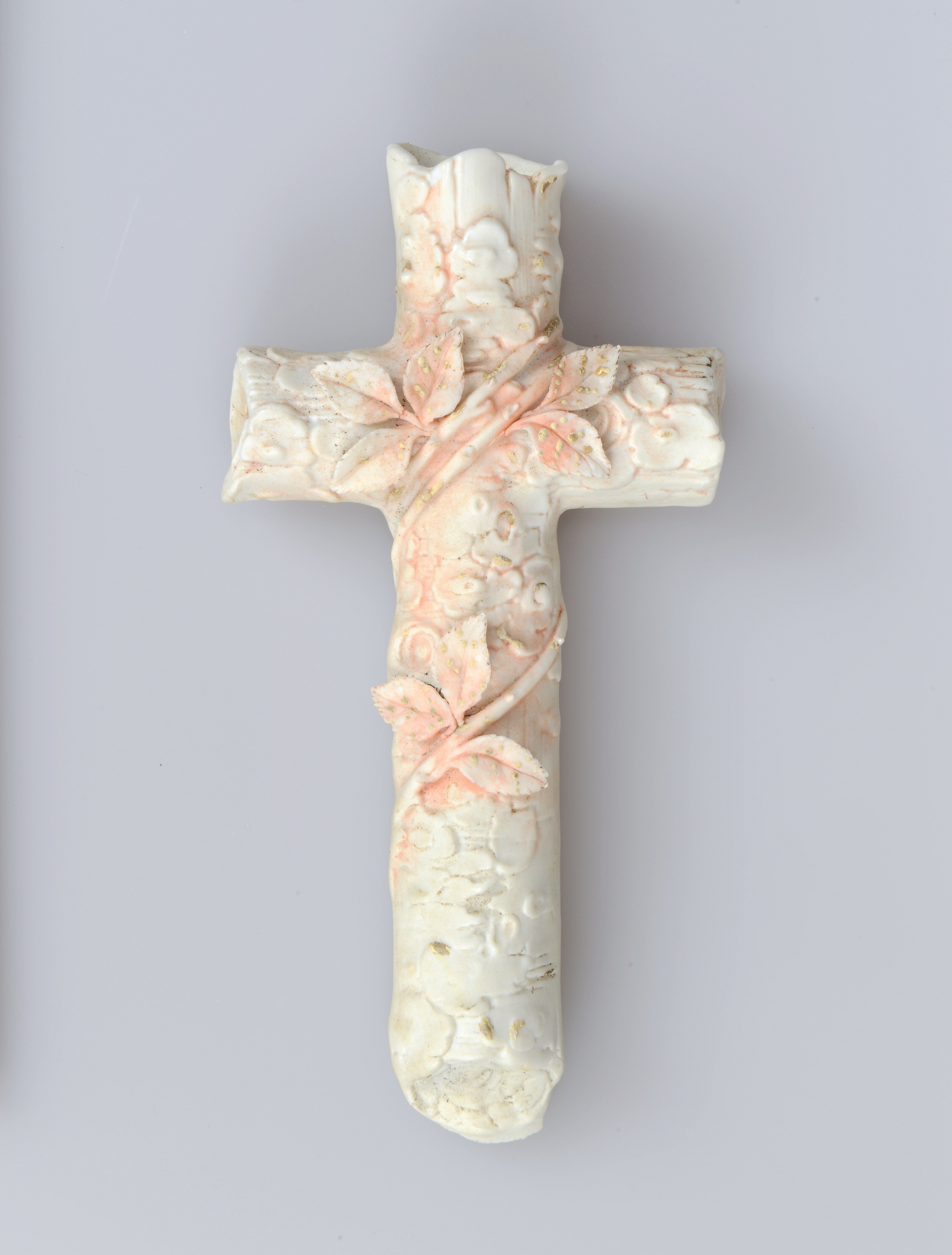 Kruis; biscuit porselein; bladertakken gewonden rond kruis en florale motieven in reliëf ; resten roze beschildering met stippen in goudverf; achterzijde ophanggat; vermoedelijk heeft hier een wijwaterbakje aan gehangen, gezien de schelpvormige breuk aan de onderzijde van het kruis; herkomst: Duitsland?