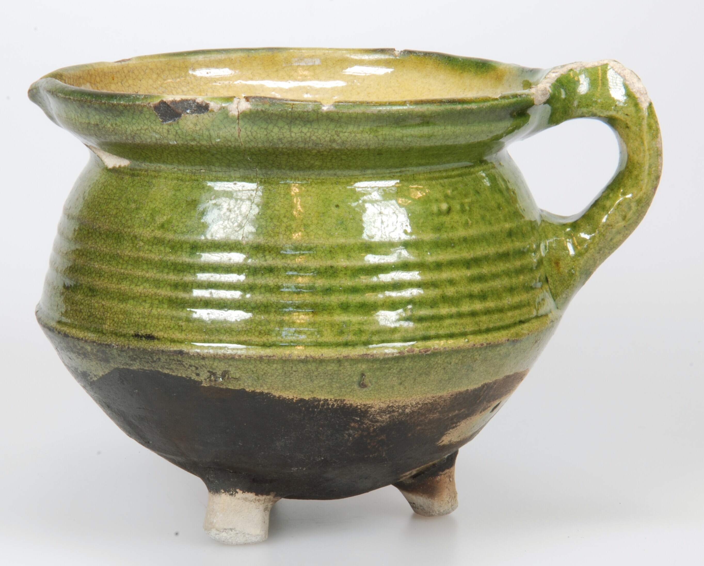 Grape; w-gra-6; grape met scherpe buikknik en kraagrand, drie poten, verticaal geknepen worstoor, schenklip; witbakkend aardewerk; inwendig loodglazuur, uitwendig loodglazuur met koperoxide; bodem beroet; herkomst: West-Nederland