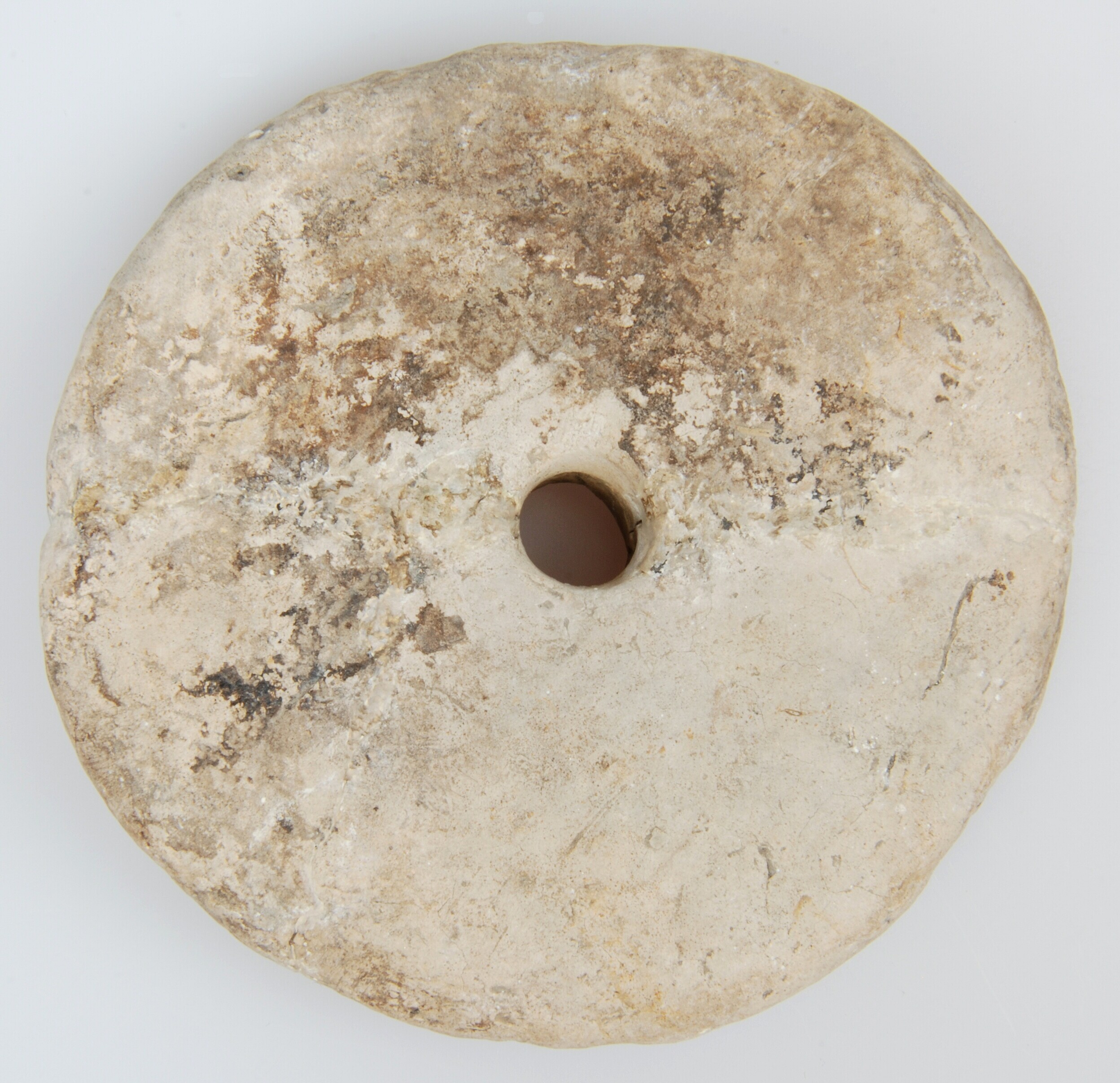 Schijf; Hoogkarspel-Jong aardewerk; centrale doorboring met een diameter van 1.8 cm en rond de doorboring is de schijf iets verdikt. concaaf van onderen en convex van boven