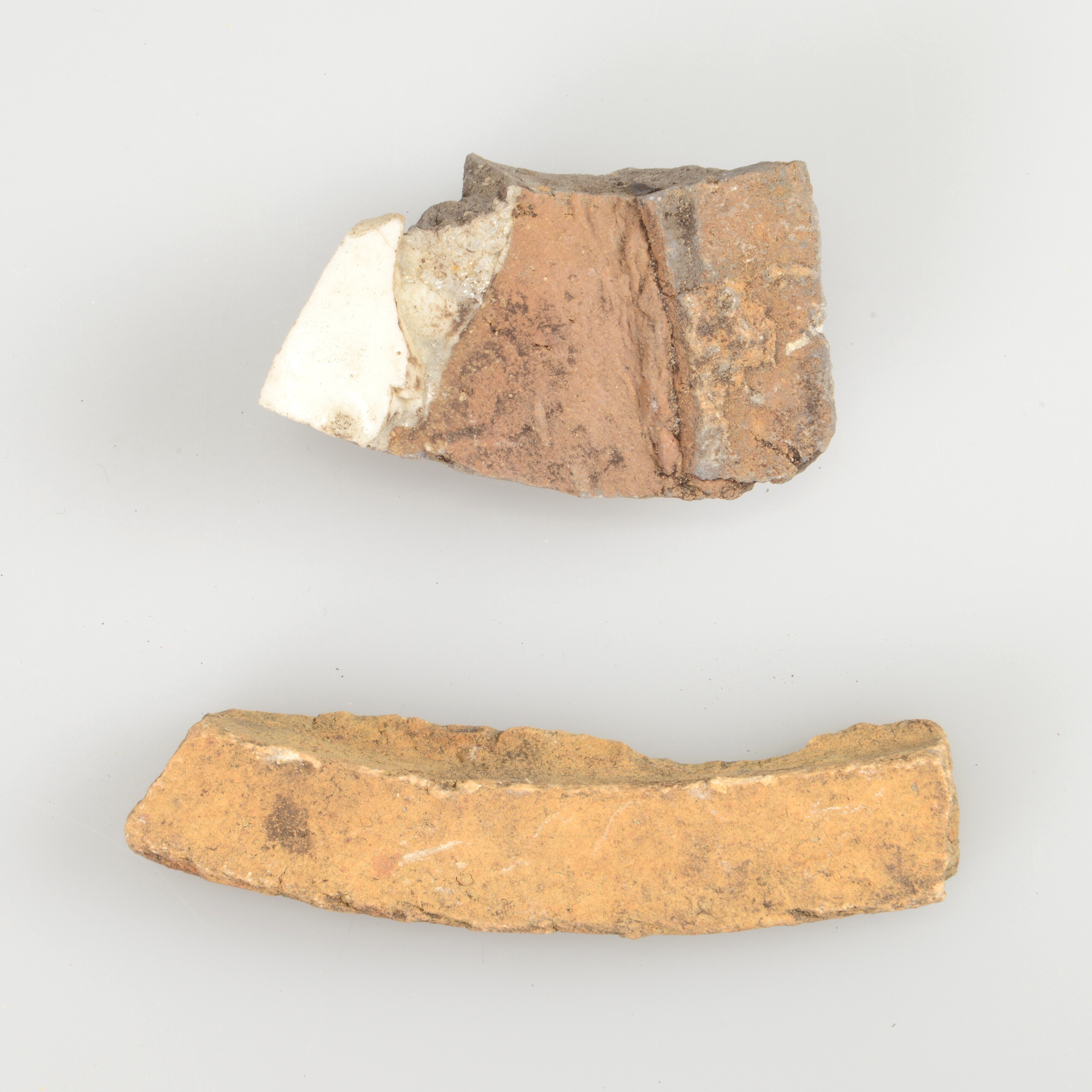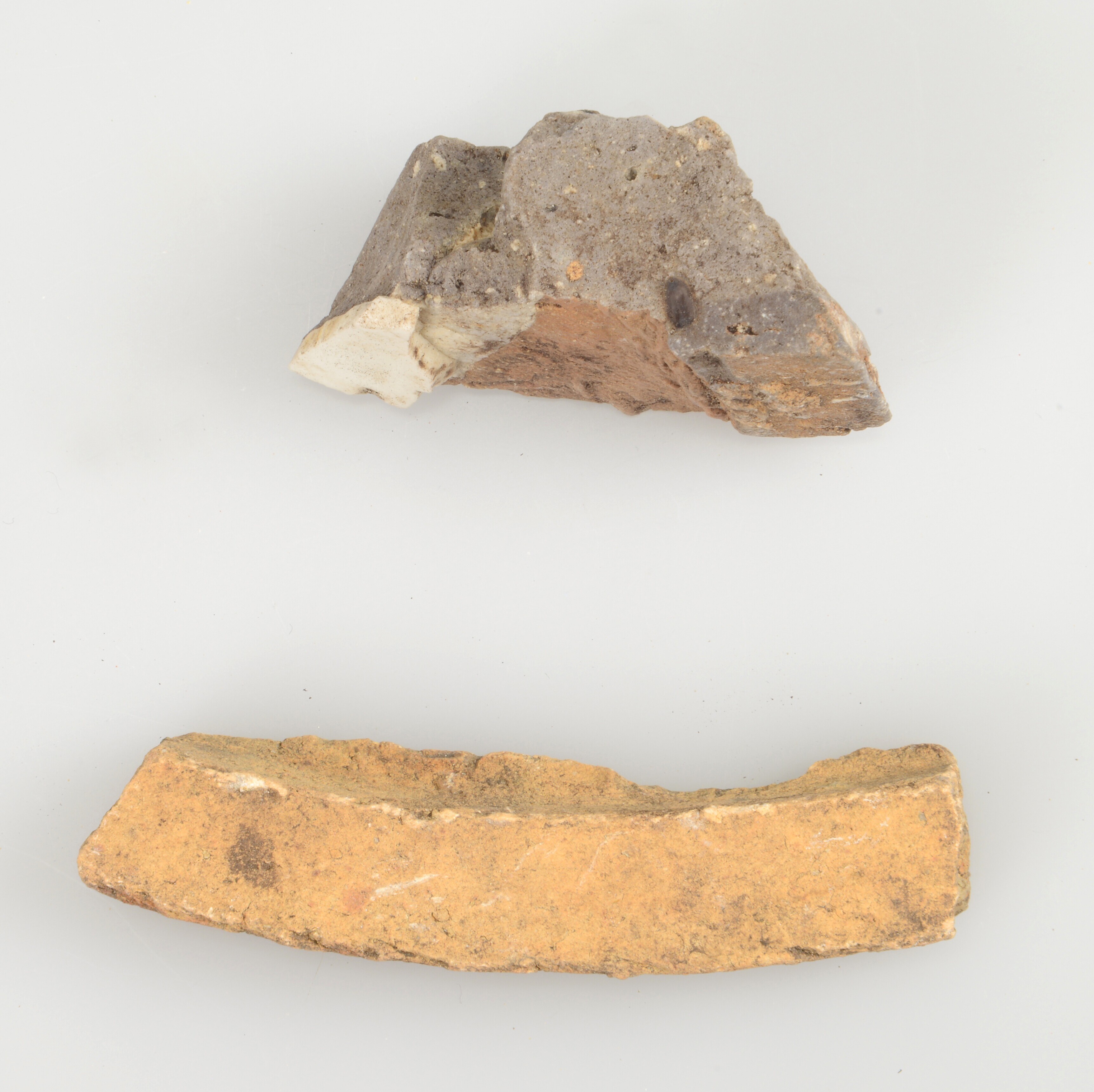 Productieafval; één reep klei voor de afdichting en één fragment compleet versinterd met hierop een fragment aangekoekt porselein en voorzien glazuur