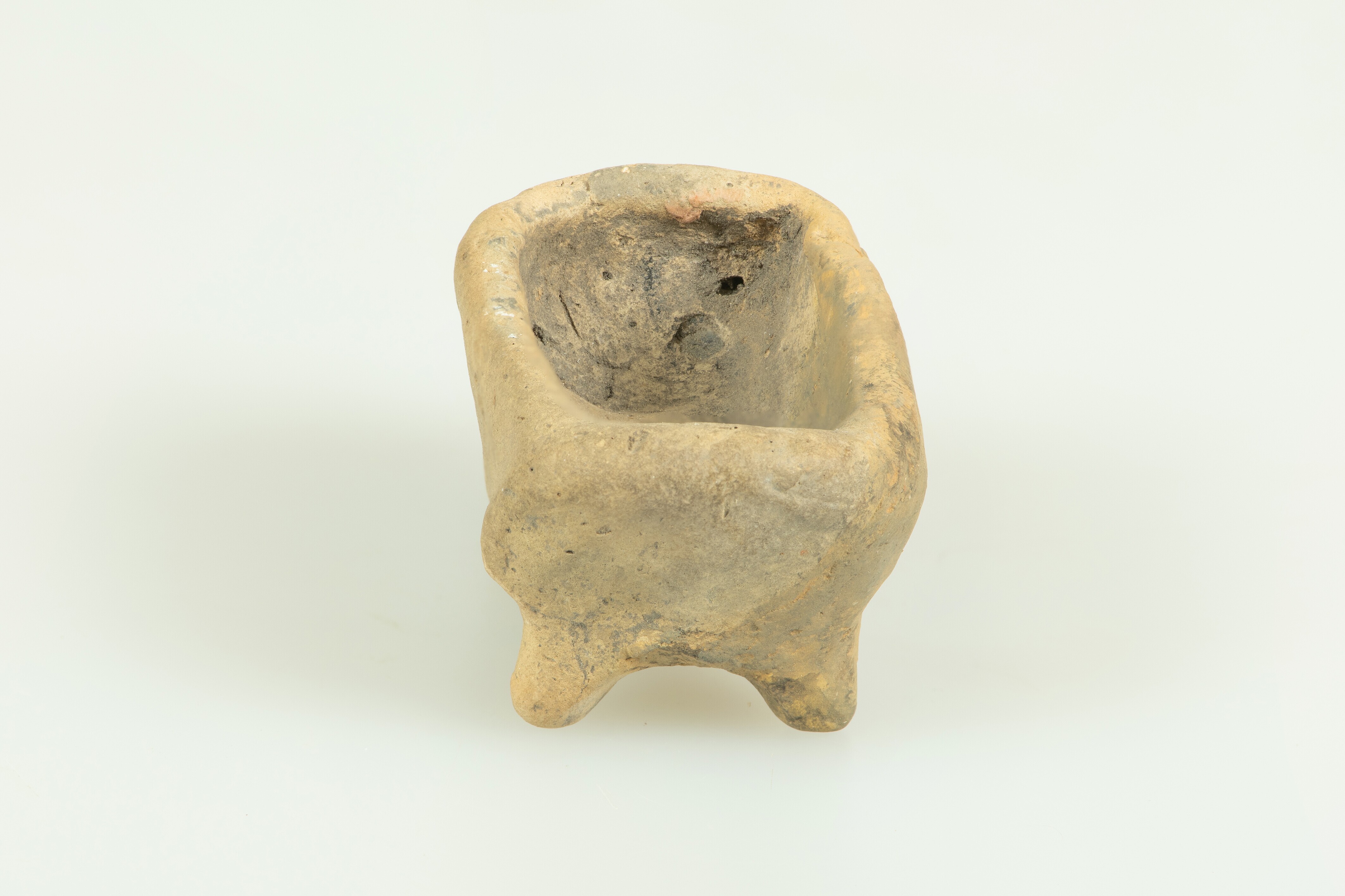 Bak; Hoogkarspel-Jong aardewerk; rechthoekig miniatuur bak met vier poten; vondstjaar: 1966