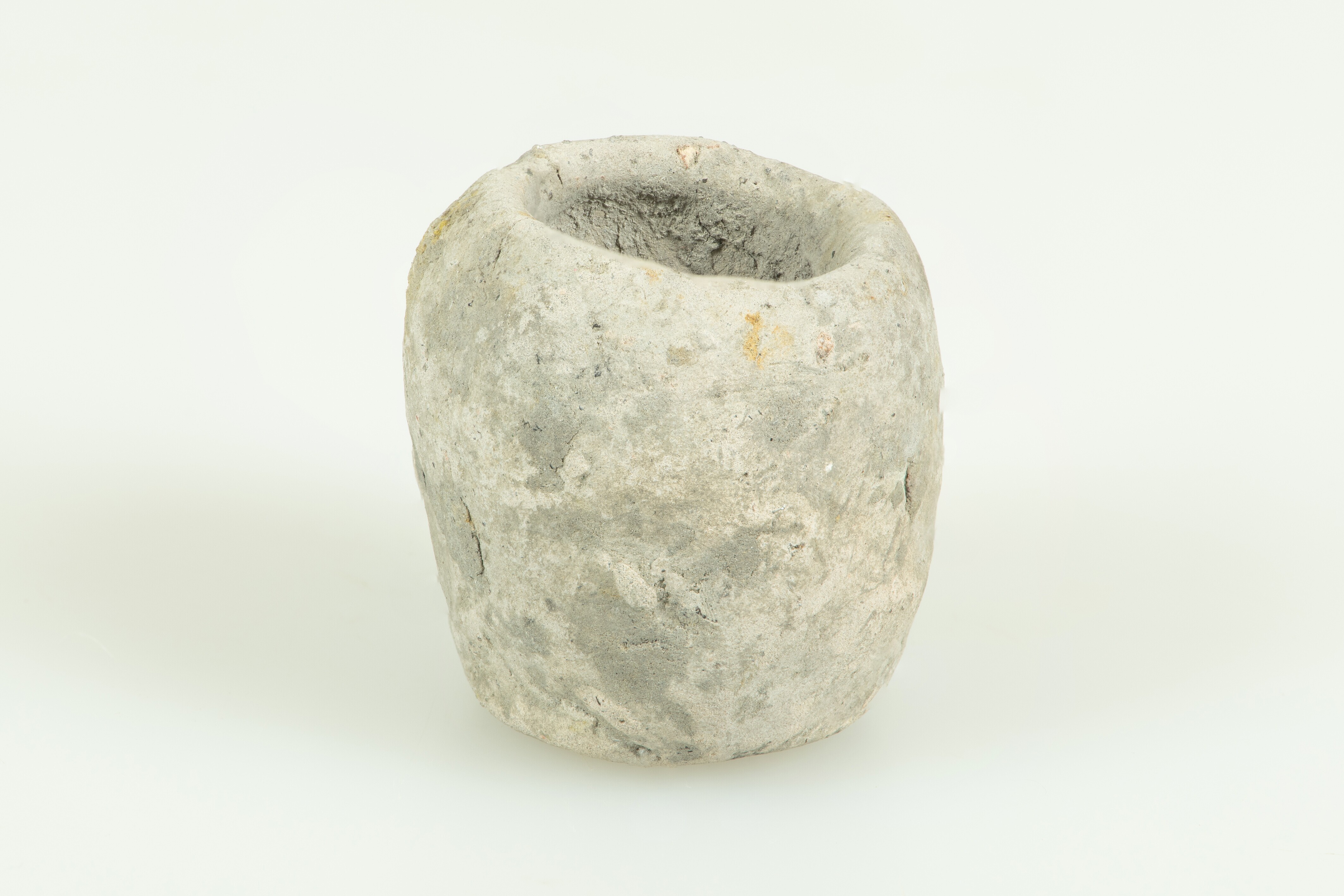 Miniatuur-potje/duimpotje; dikwandig met onregelmatig gevormde rand; standvlak; vondstdatum: 11-4-1967