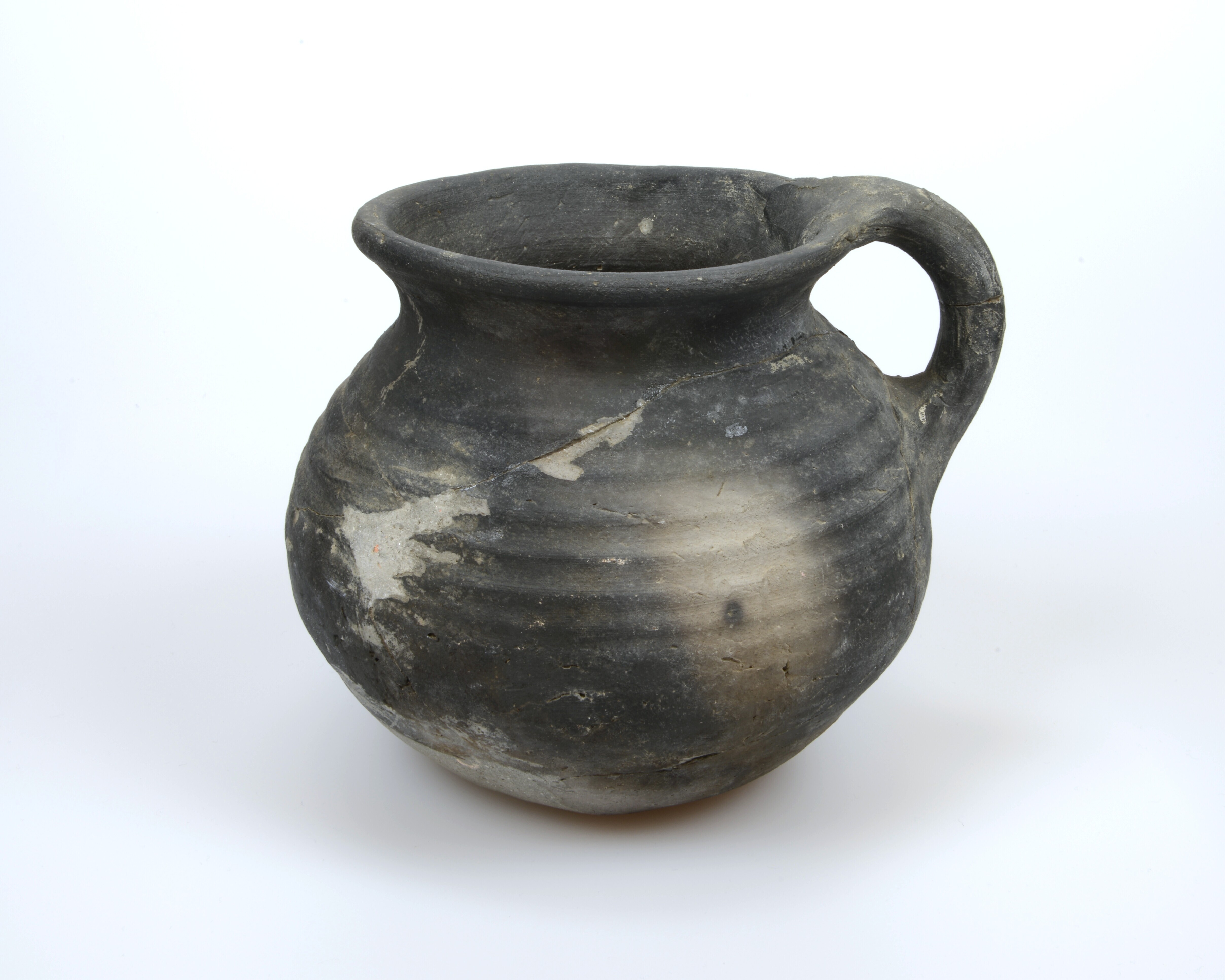 Grape; g-gra-5; bolle grape met uitstaande, rechte rand, drie kleine standlobben (ontbreken), verticaal worstoor; grijsbakkend aardewerk; herkomst: West-Nederland; vondstjaar: 1961