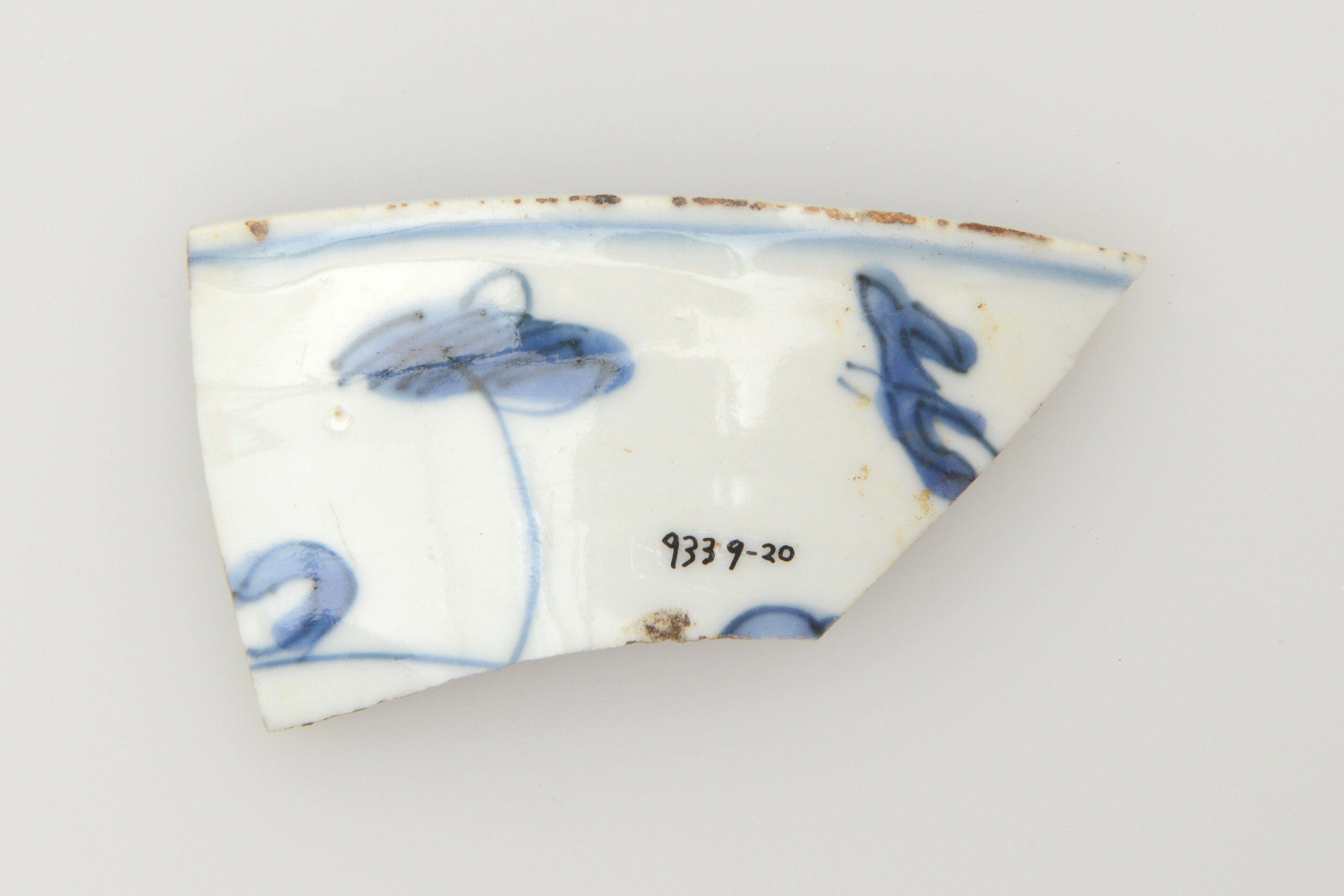 Kom; p-kom-; Aziatisch (vroeg) porselein; veldspaatglazuur; blauw op wit: inwendig spaartechniek, uitwendig bloemen; herkomst: China