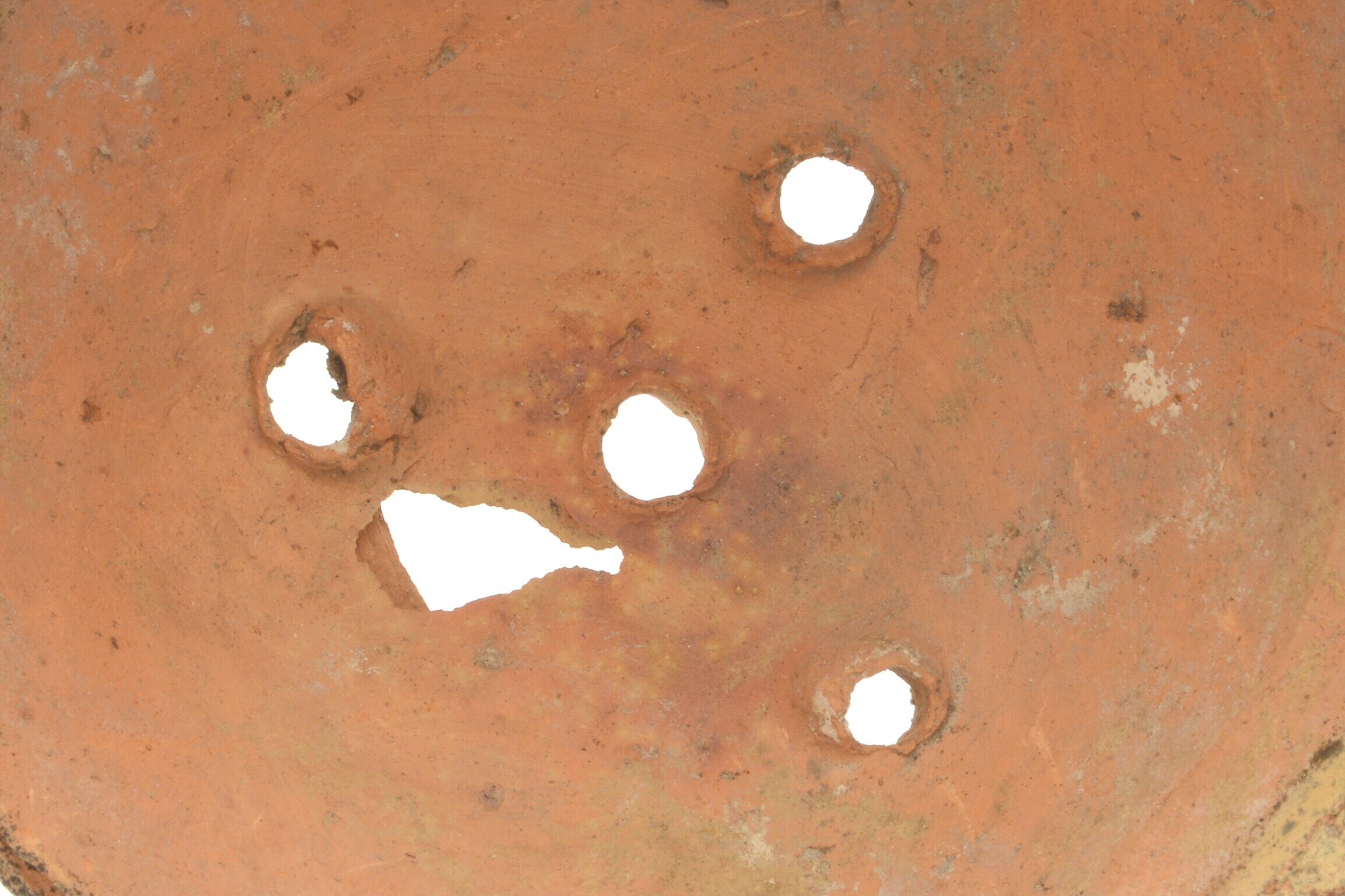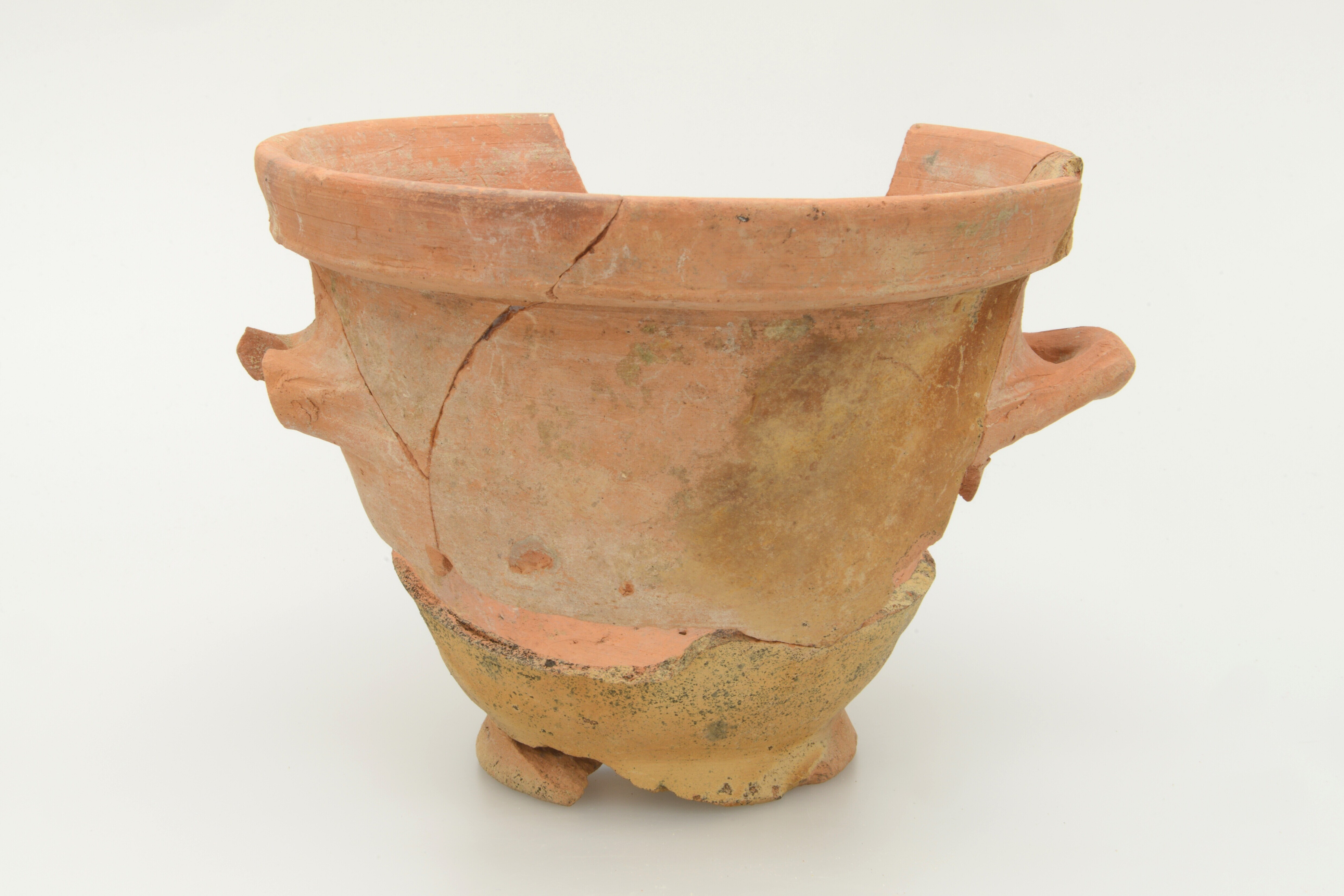 Bloempot; r-blo-26; bloempot met omgeslagen rand; roodbakkend aardewerk; ongeglazuurd; gaten in bodem; standring; twee horizontale oren