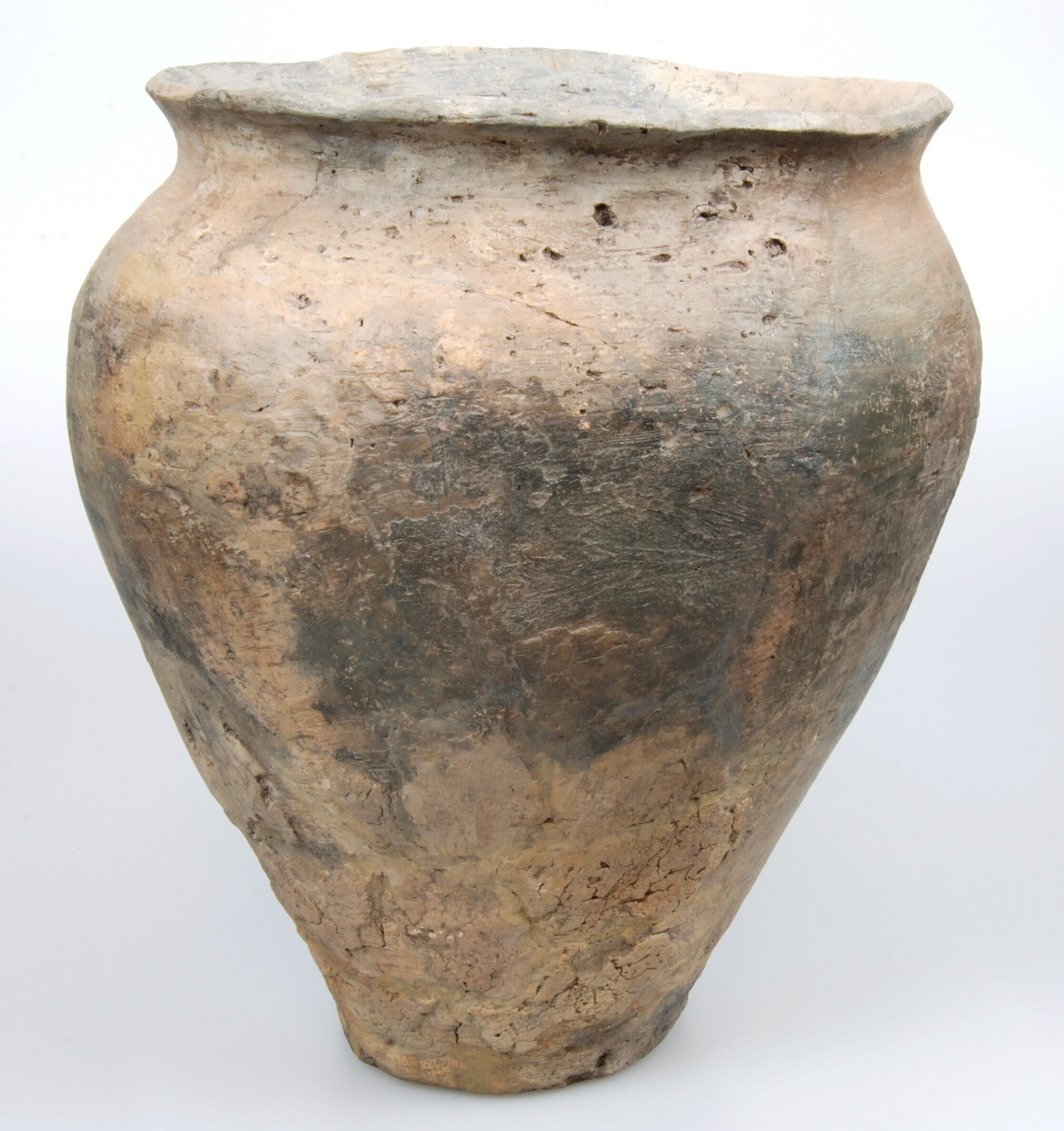 Kookpot; type Diederik O-Ib; nauwmondige kookpot met steile B-rand; standvlak; wand besmeten en beroet; potgruis magering