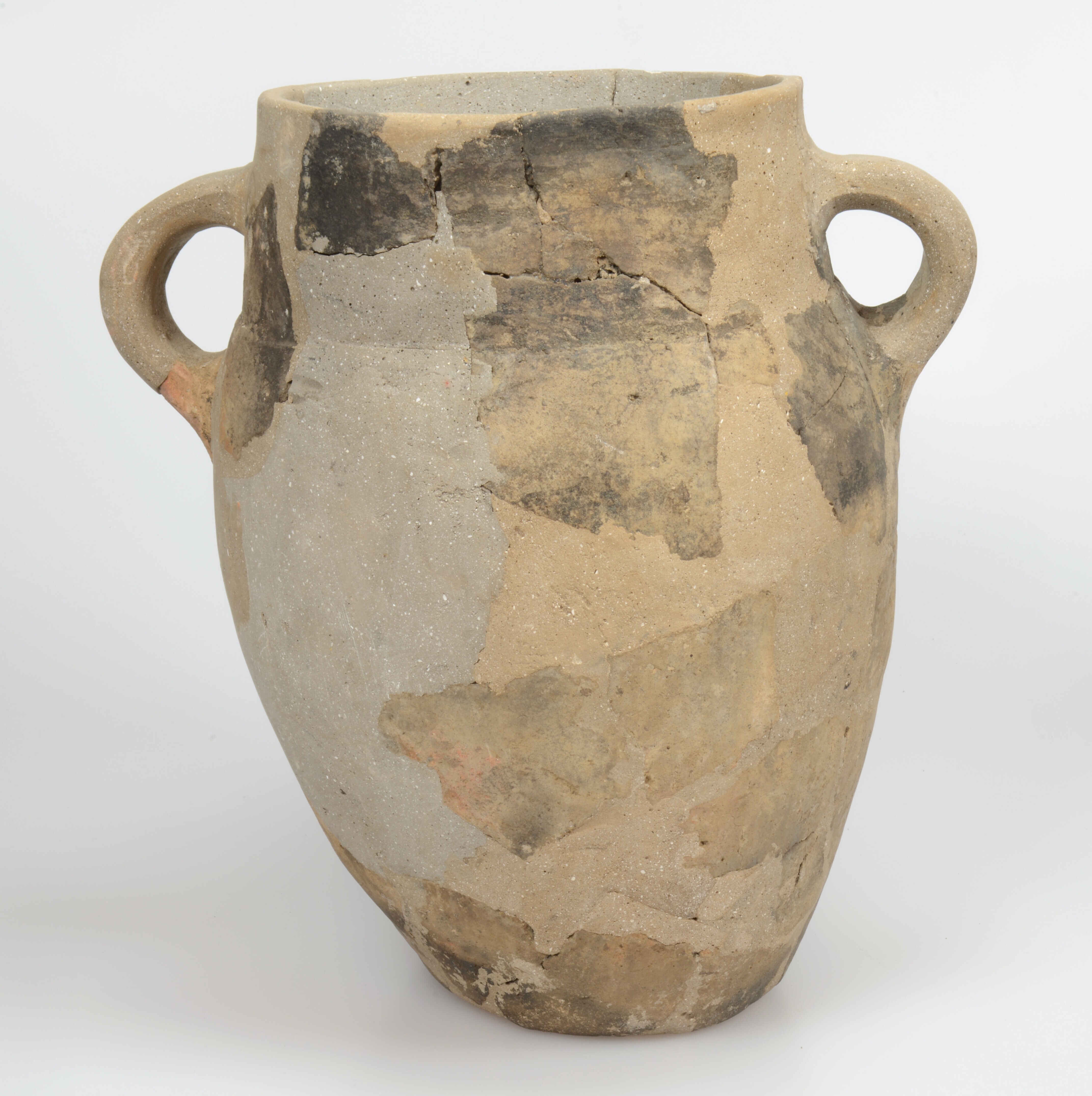 Pot; drieledig model met een lange rechte nek en twee verticale lintoren; standvlak; fijne steengruis magering