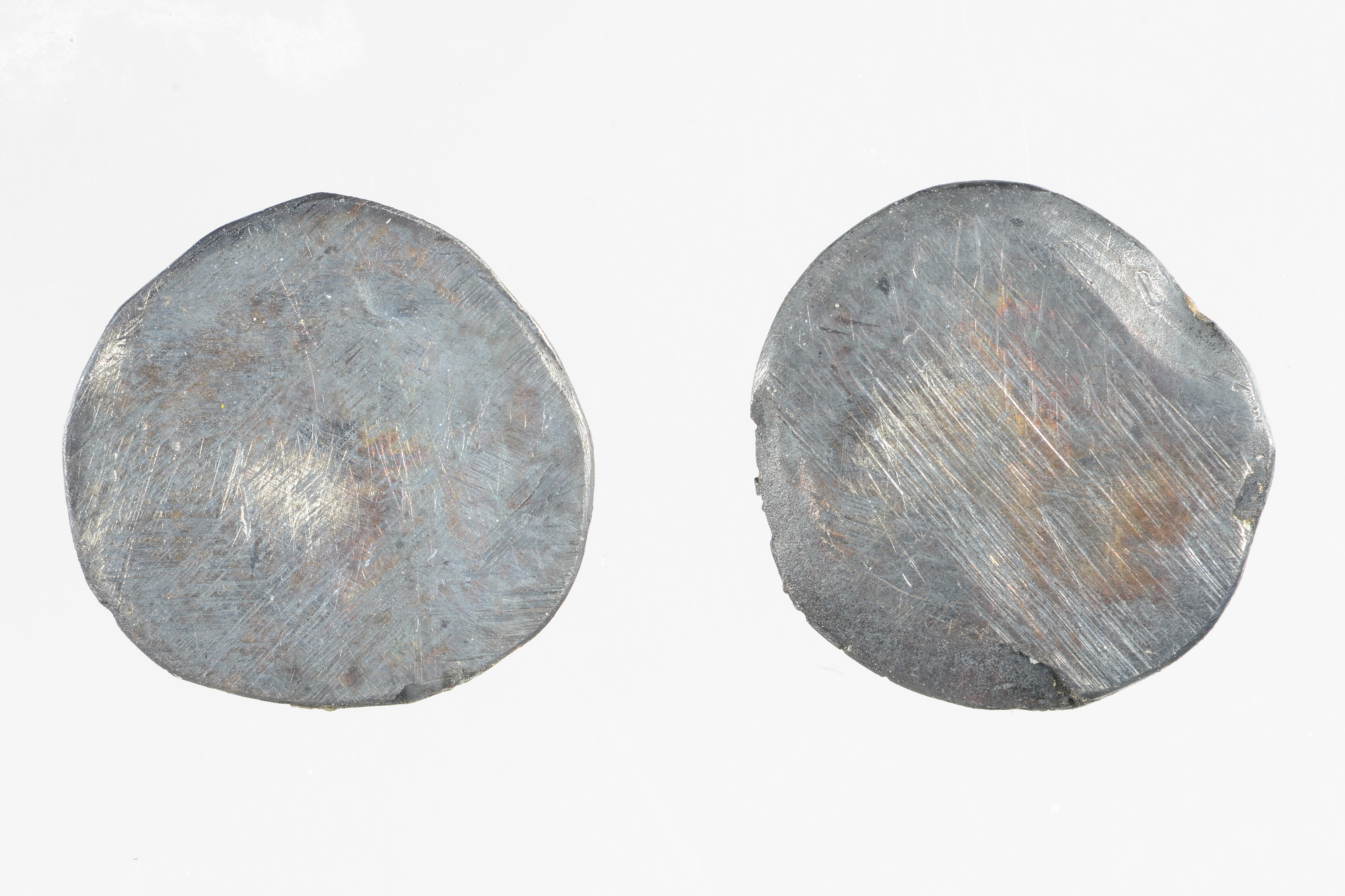 Twee replica's; penning; 1x voorzijde en 1x keerzijde; Holland Graafschap (1049-1581); Floris V (1256-1296); vz.: hoofd naar linksbinnen parelcirkel, met omschrift (drie punten) F COMES OLLANDIE; kz.: kort gevoet kruis binnen parelcirkel, met omschrift (drie punten) MONE MEDEN[BL]EC
