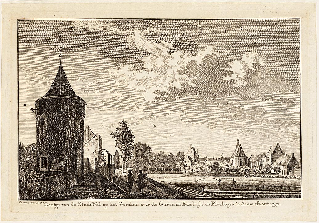 Gezigt van de Stads Wal op het Weeshuis over de Garen en Bombasyden Bleekerije in Amersfoort. 1759.