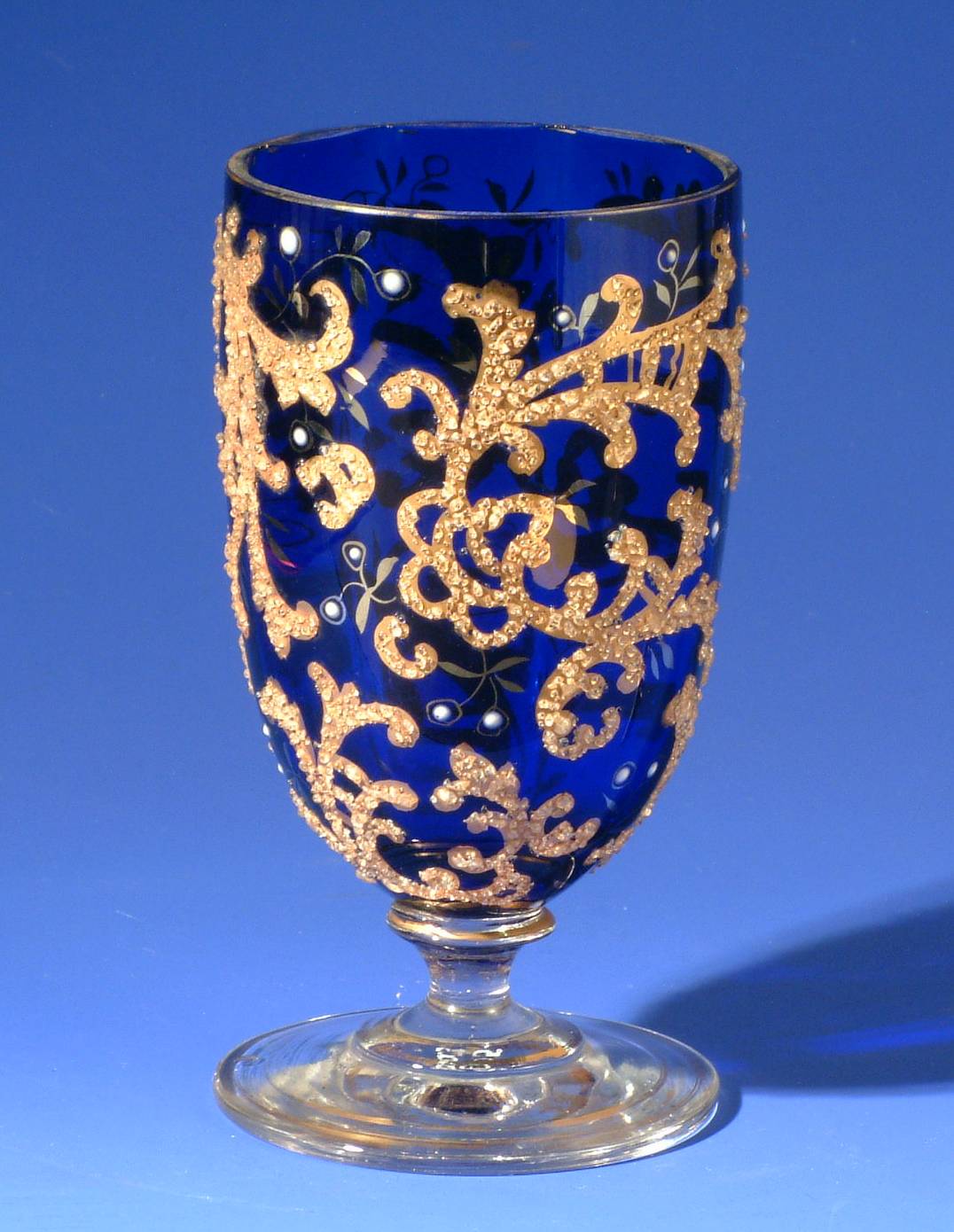 blauw glazen beker op voet versierd met stukjes glas en verguld plantmotief