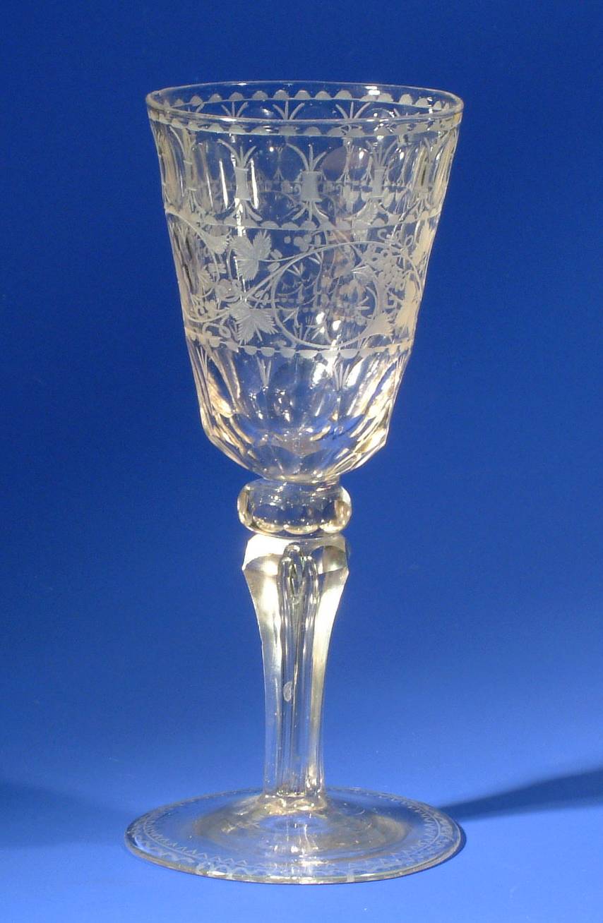 dekselbokaal gegraveerd met bloemen en schuine banen van ronde facetten