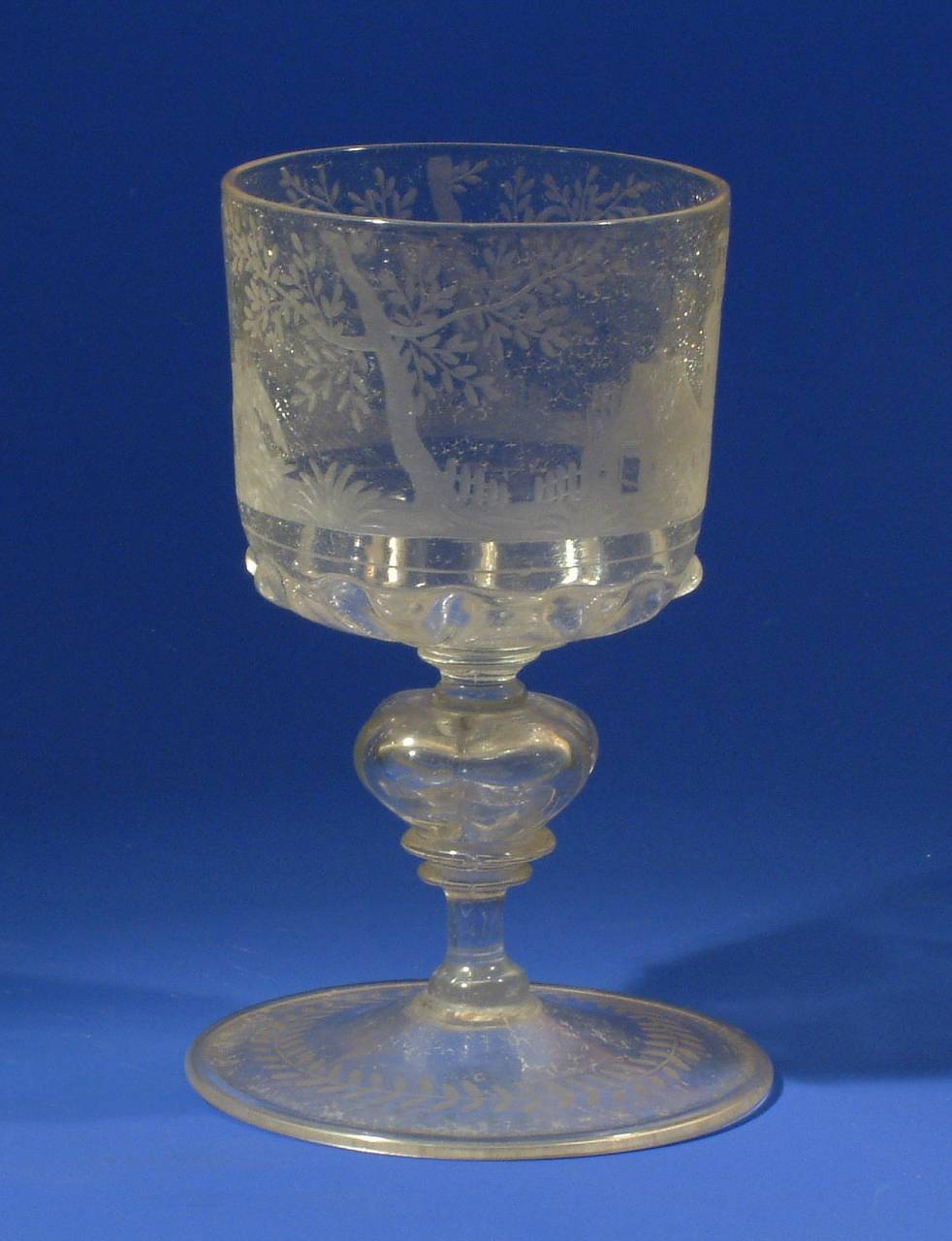 kelkglas gegraveerd met 2 huisjes en toren, bomen en trekkebekkende vogels