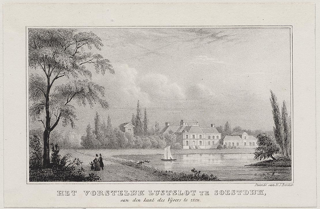 Het vorstelijk lustslot te Soestdijk van den kant des vijvers te zien, Baarn