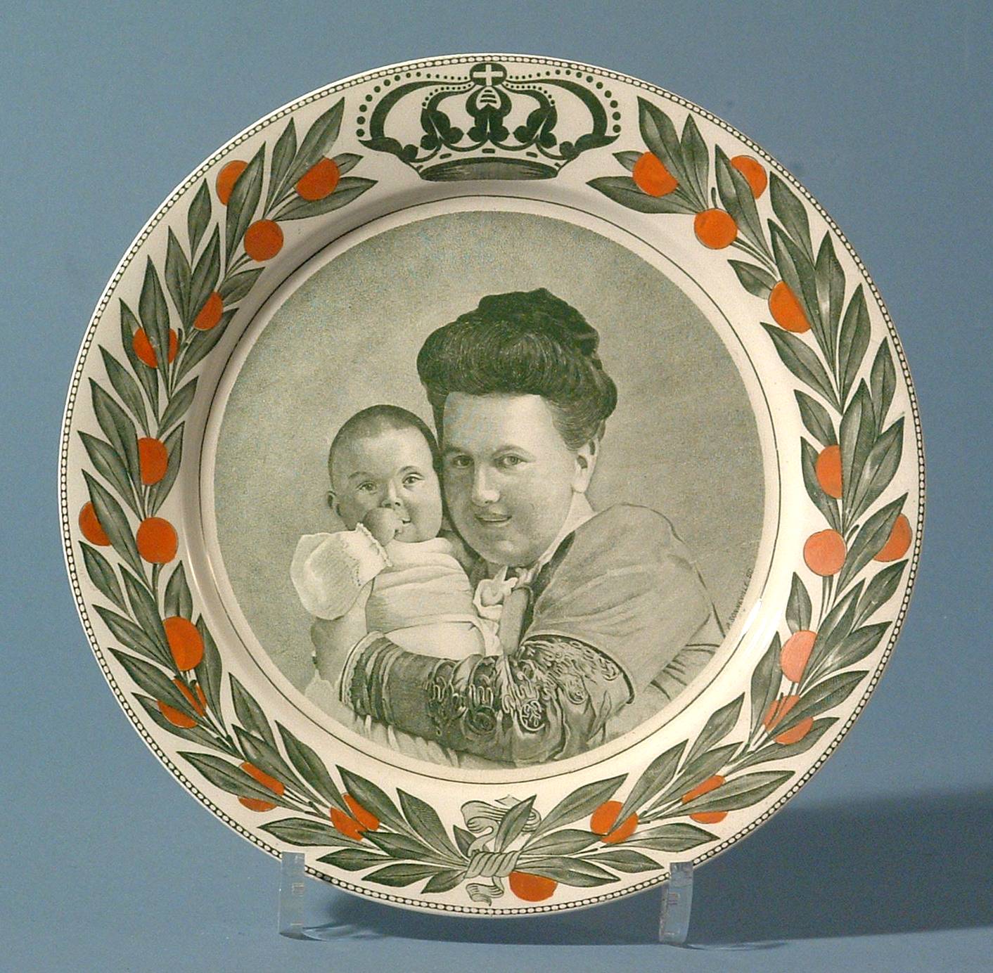 Koningin Wilhelmina en prinses Juliana. Herinneringsbord ter gelegenheid van de eerste verjaardag van Juliana