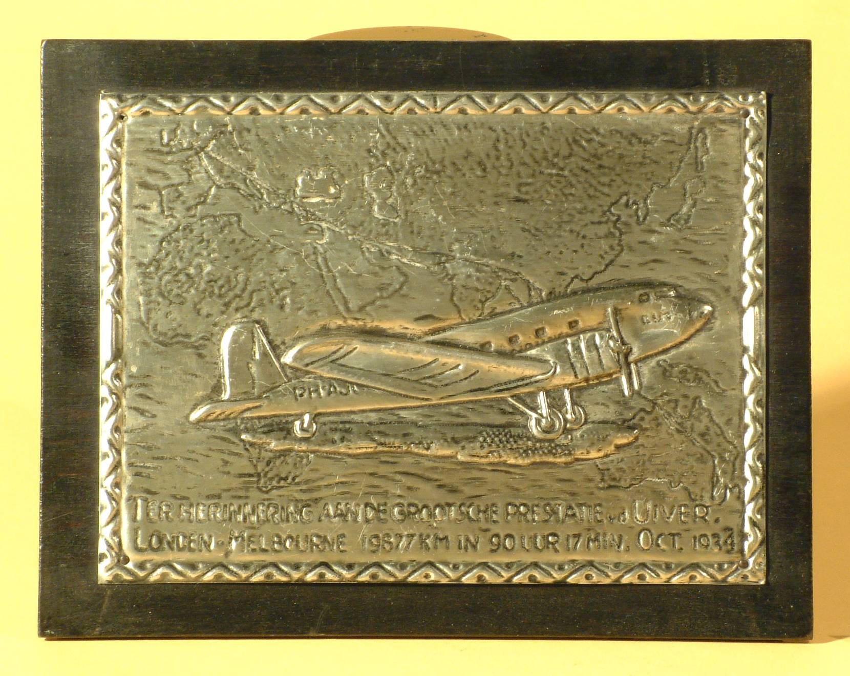 Plaquette ter herinnering aan vliegroute Londen - Melbourne, 20 - 24 oktober 1934.