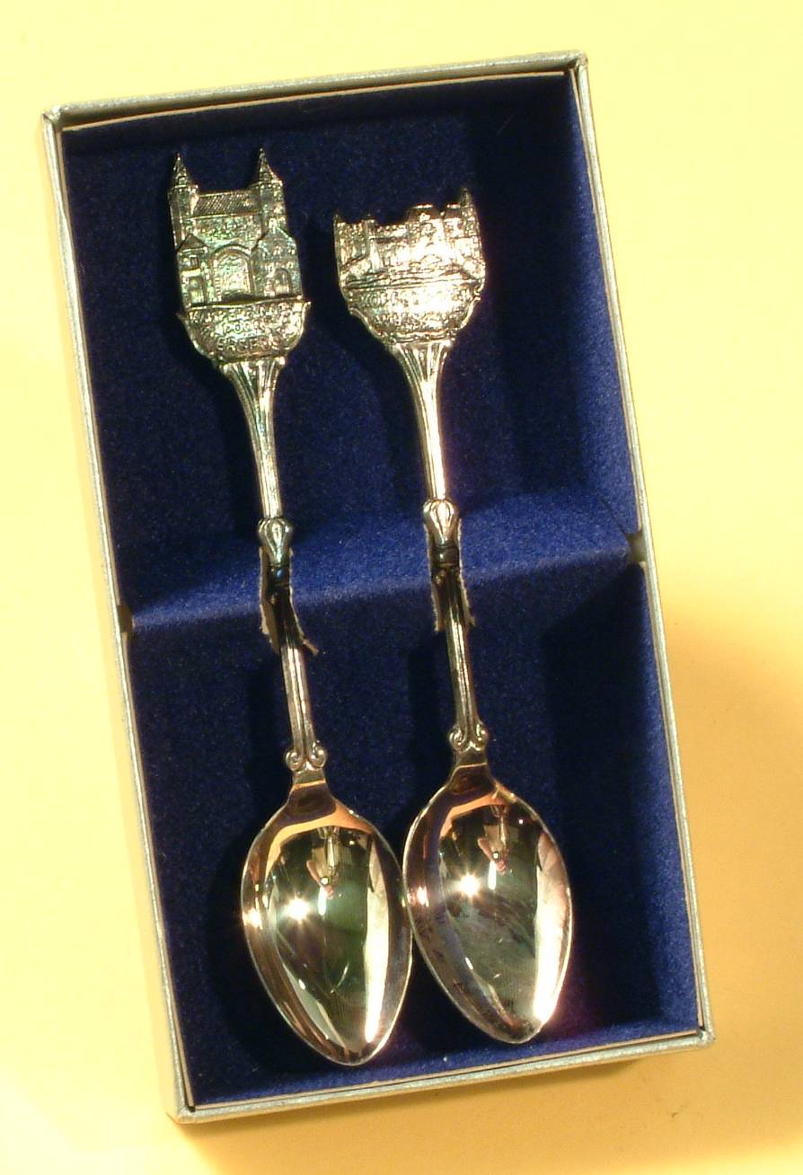 Twee lepeltjes met afbeeldingen van gebouwen in Amersfoort, in doosje