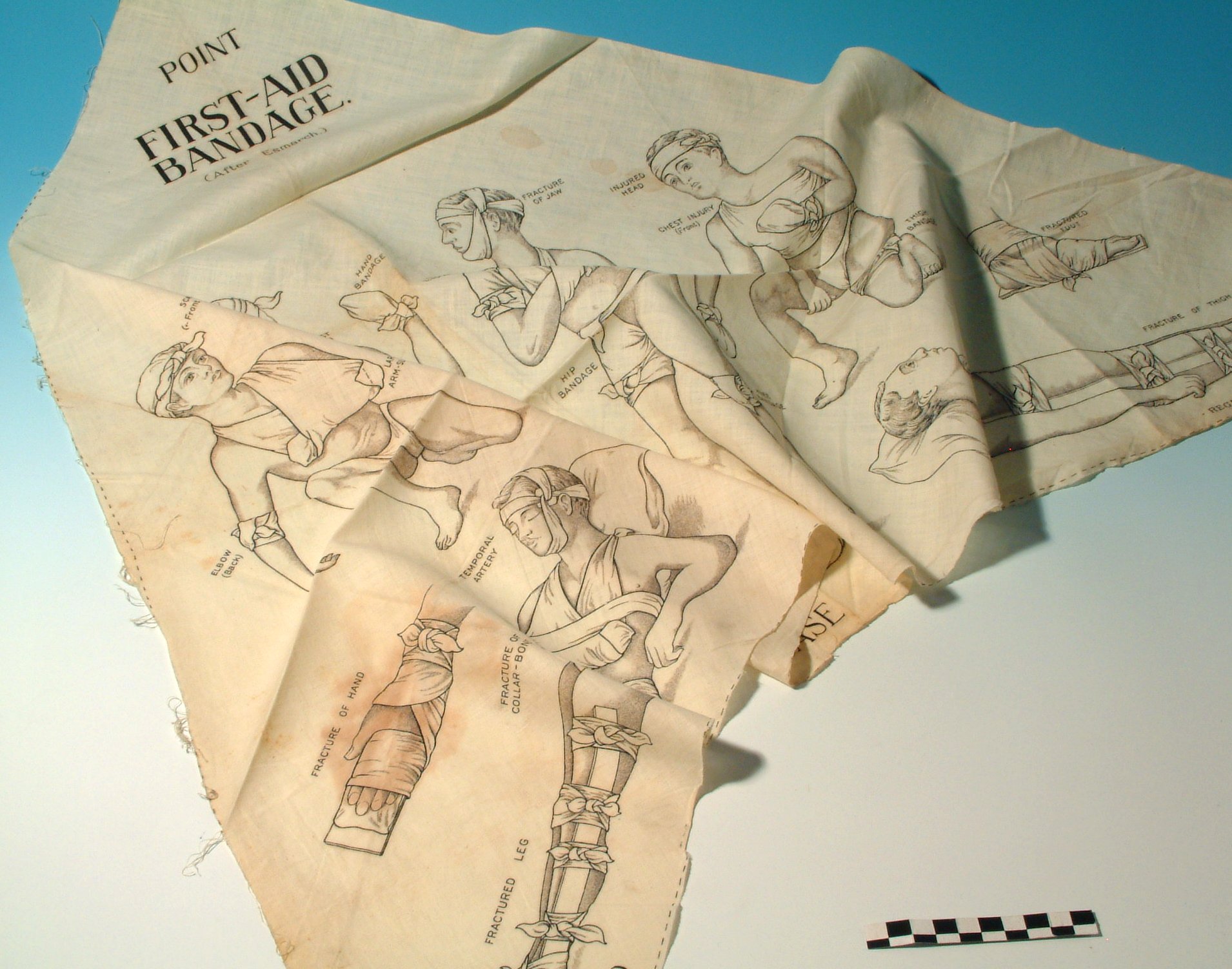 Mitella, met afbeeldingen m.b.t. gebruiksmogelijkheden. Gebruikt bij Militair Geneeskundige Dienst.