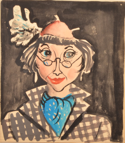 Tekening van vrouw, gekleed in mantel en hoedje.