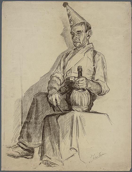 Portret van man met feestmuts en wijnfles