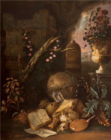 Vanitasstilleven met globe en palet