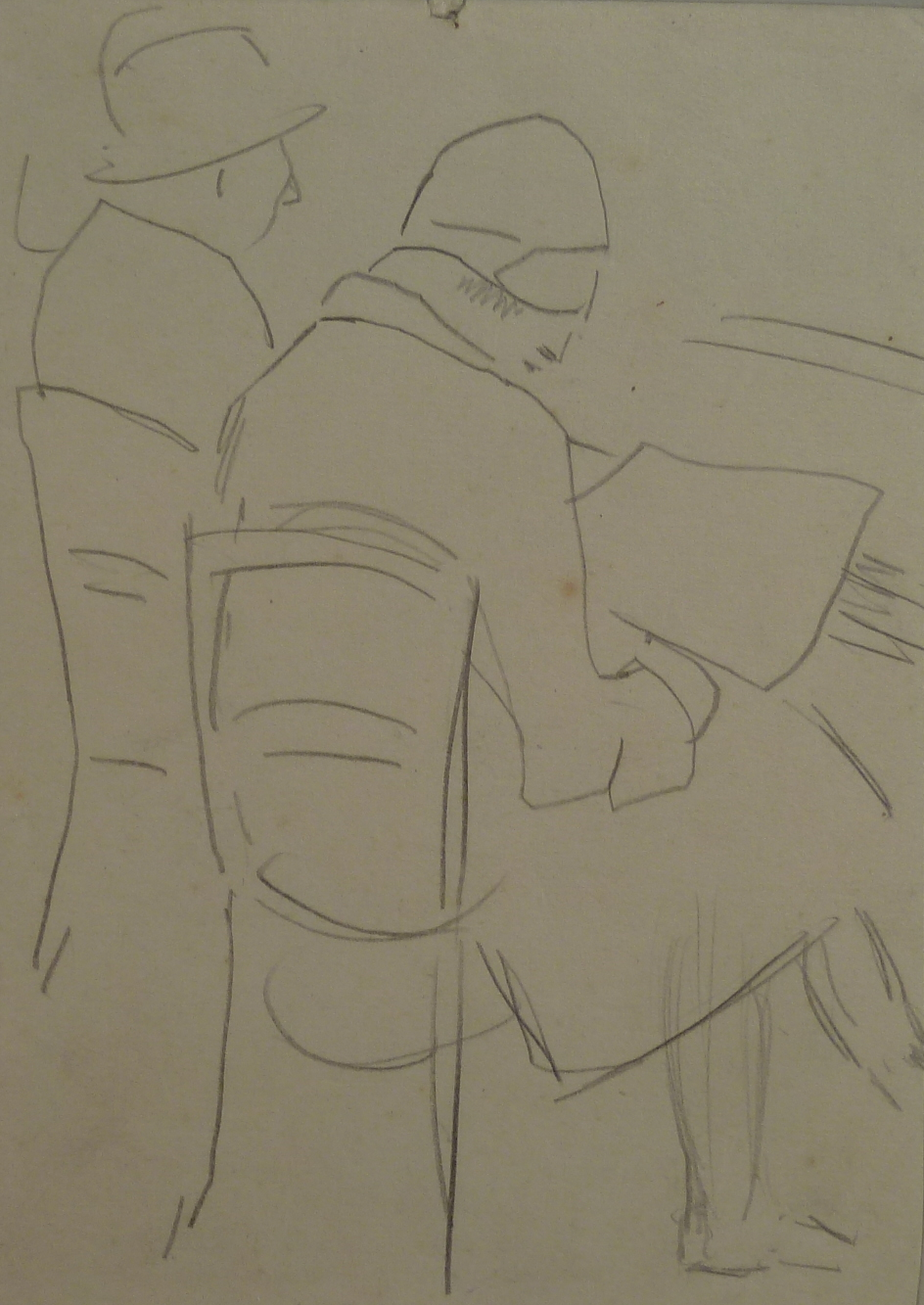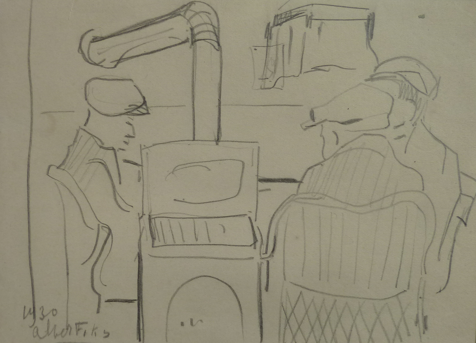 Echtpaar: zij leest de krant en drie mannen rond de kachel