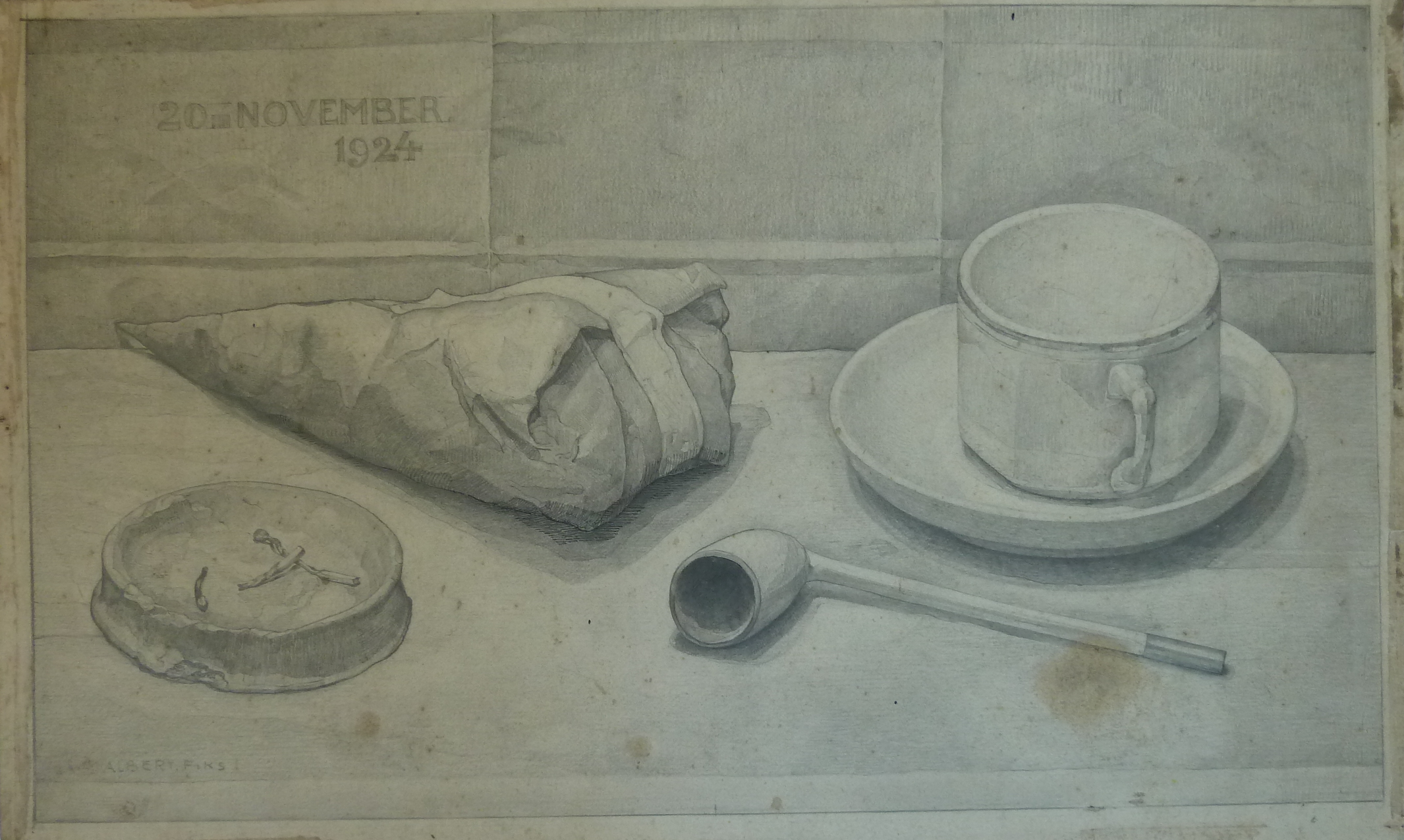 Stilleven: kop en schotel, pijp, asbak en zak pijptabak
