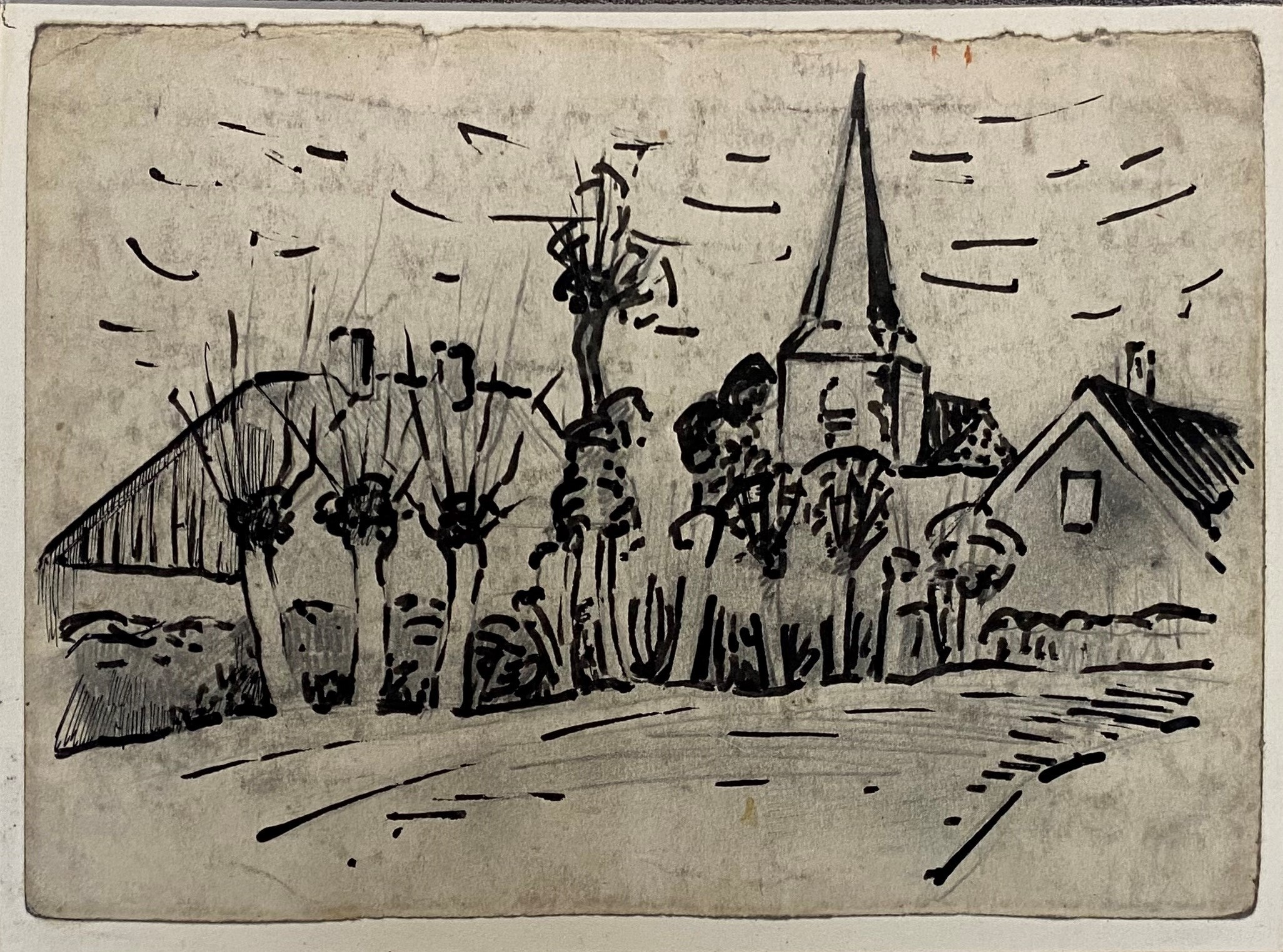 Dorpsgezicht met knotwilgen en kerktoren