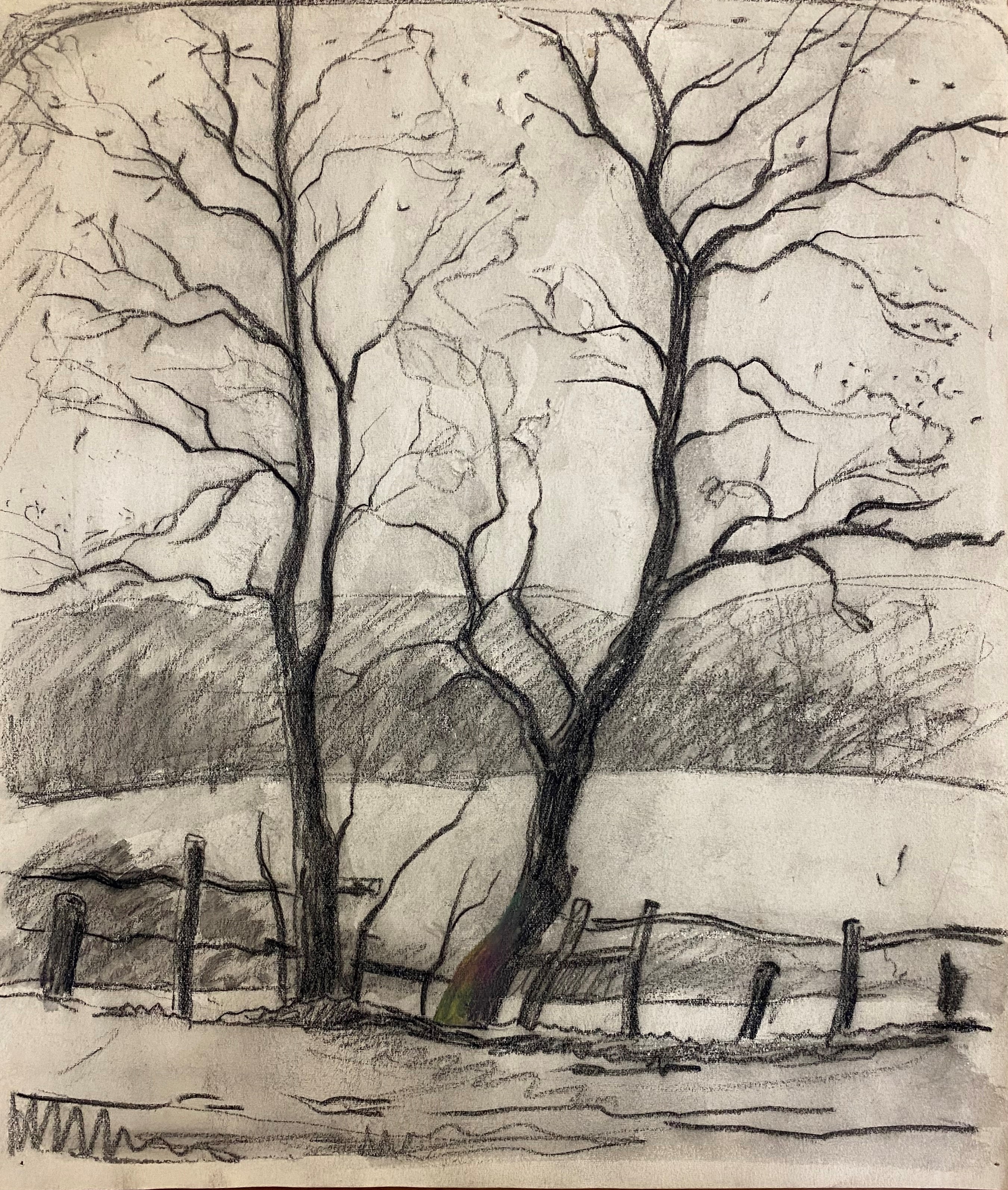 Landschap met twee bomen en een hek