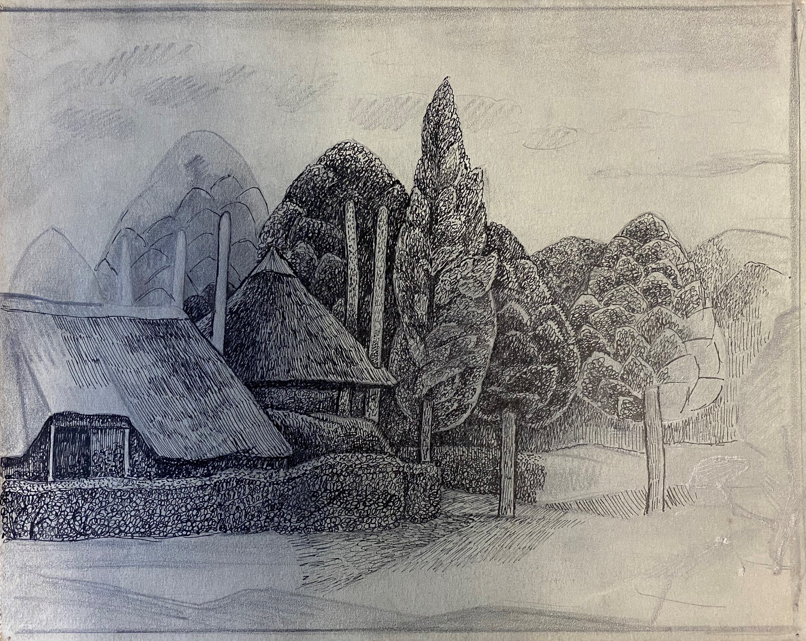 Boerderij en hooimijt met bomen
