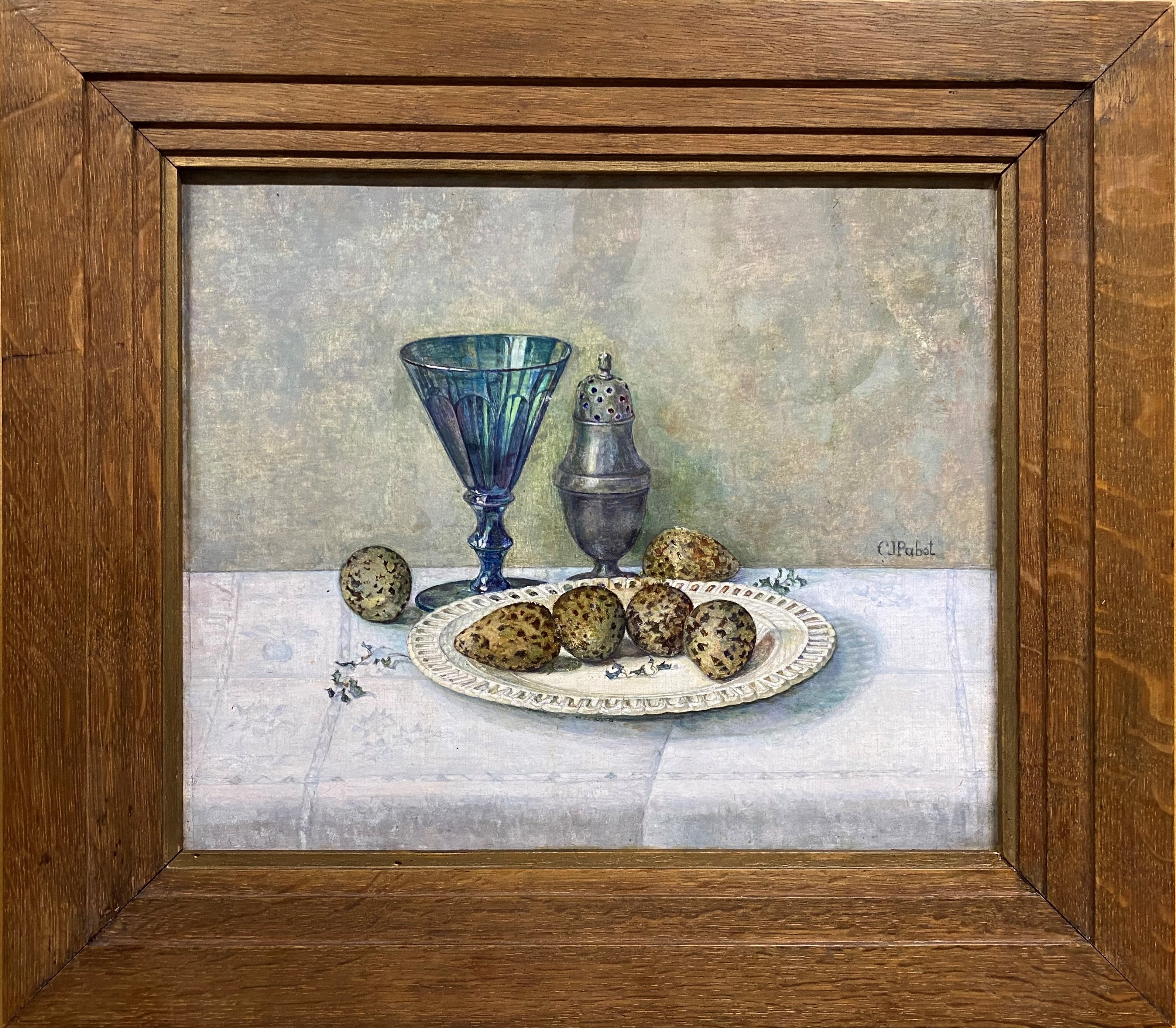 Stilleven met groen Rijnwijnglas, tinnen strooier en creamware schaaltje waarop kwarteleitjes