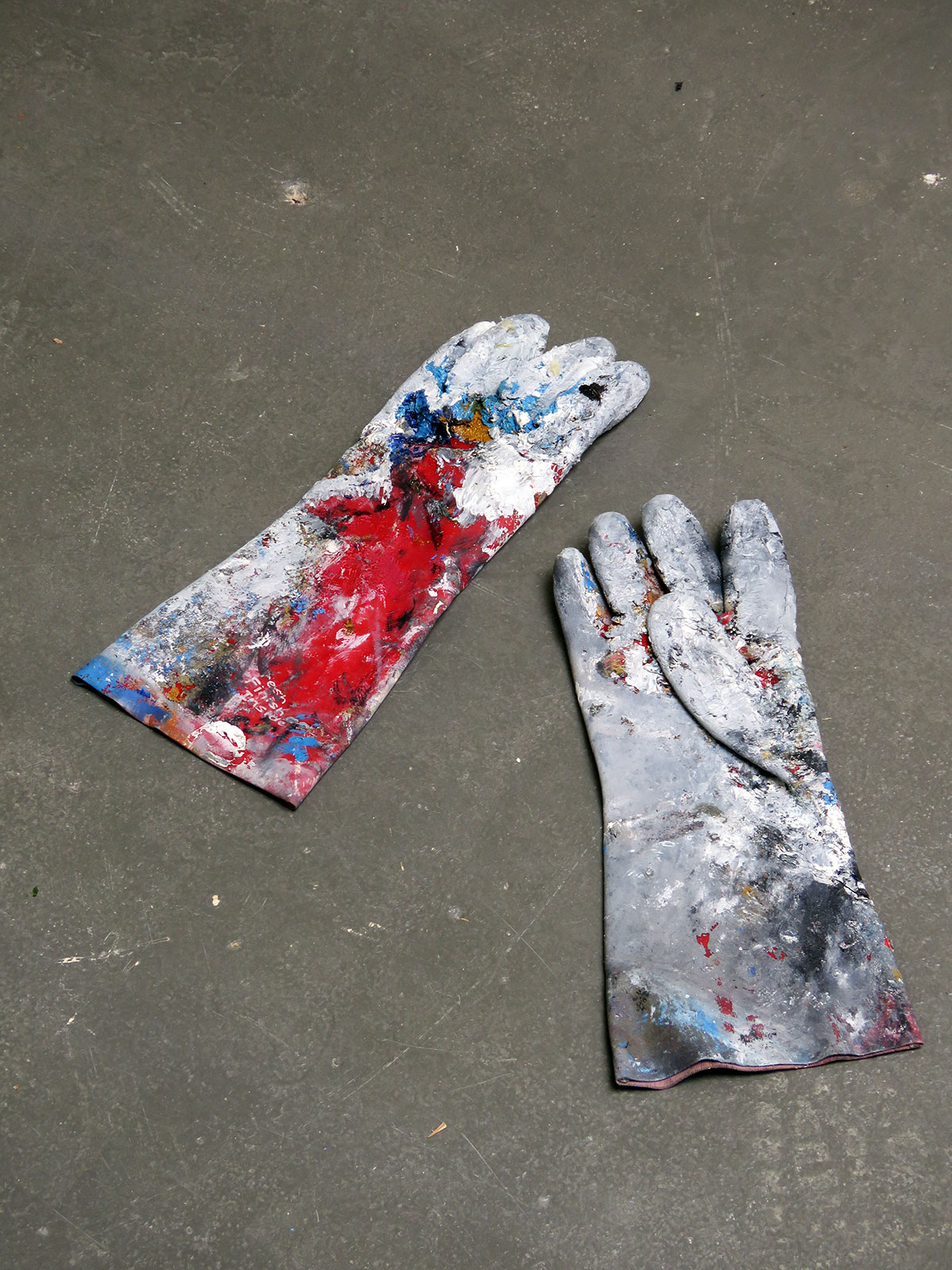 Een paar rode verfhandschoenen van de kunstenaar Armando