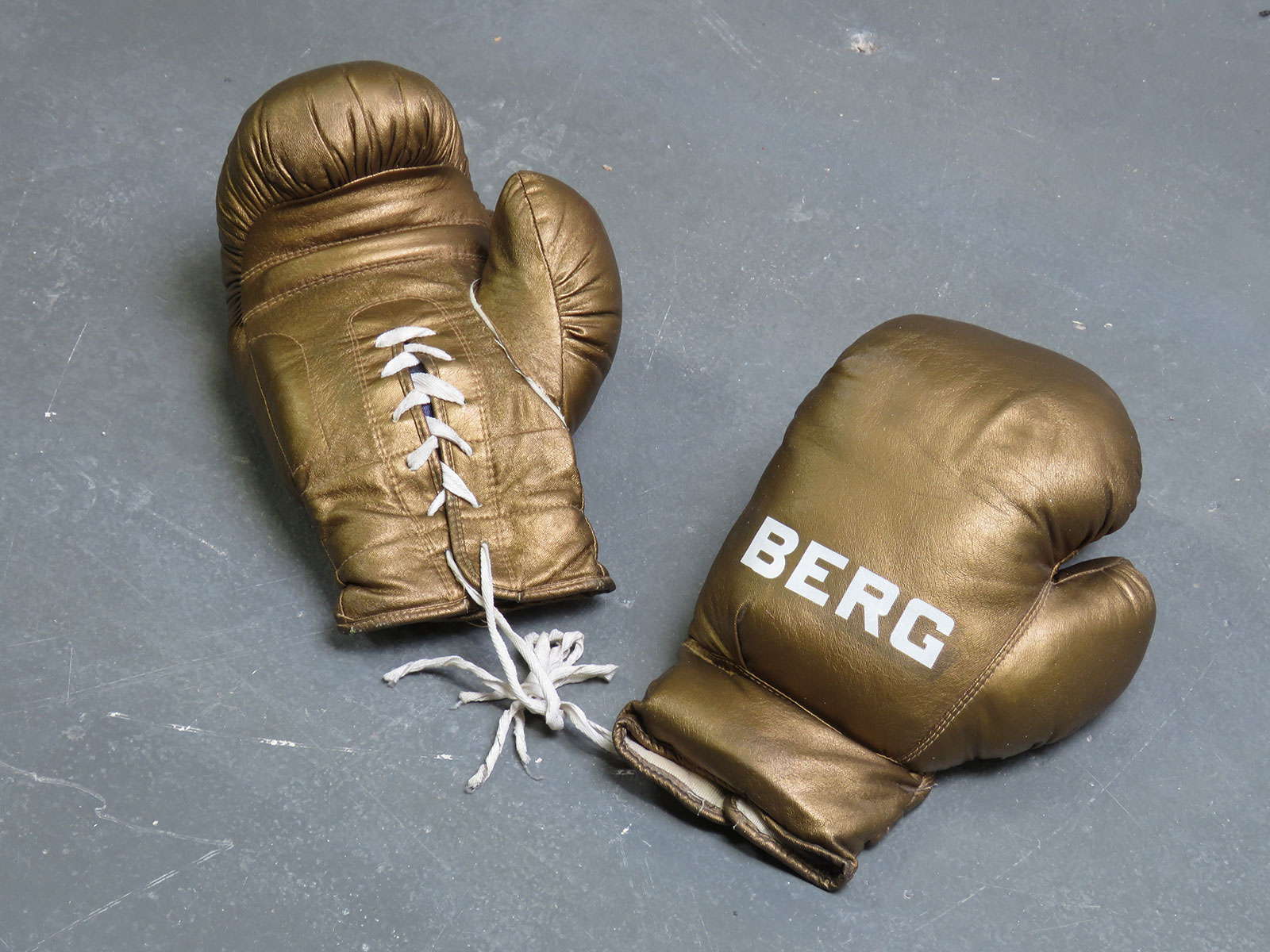 Een paar goudkleurige bokshandschoenen van de kunstenaar Armando