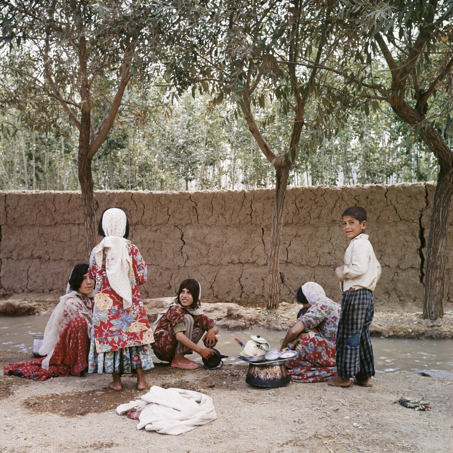 Vrouwen doen aan een door het dorp stromend beekje de afwas. Pasargarde.