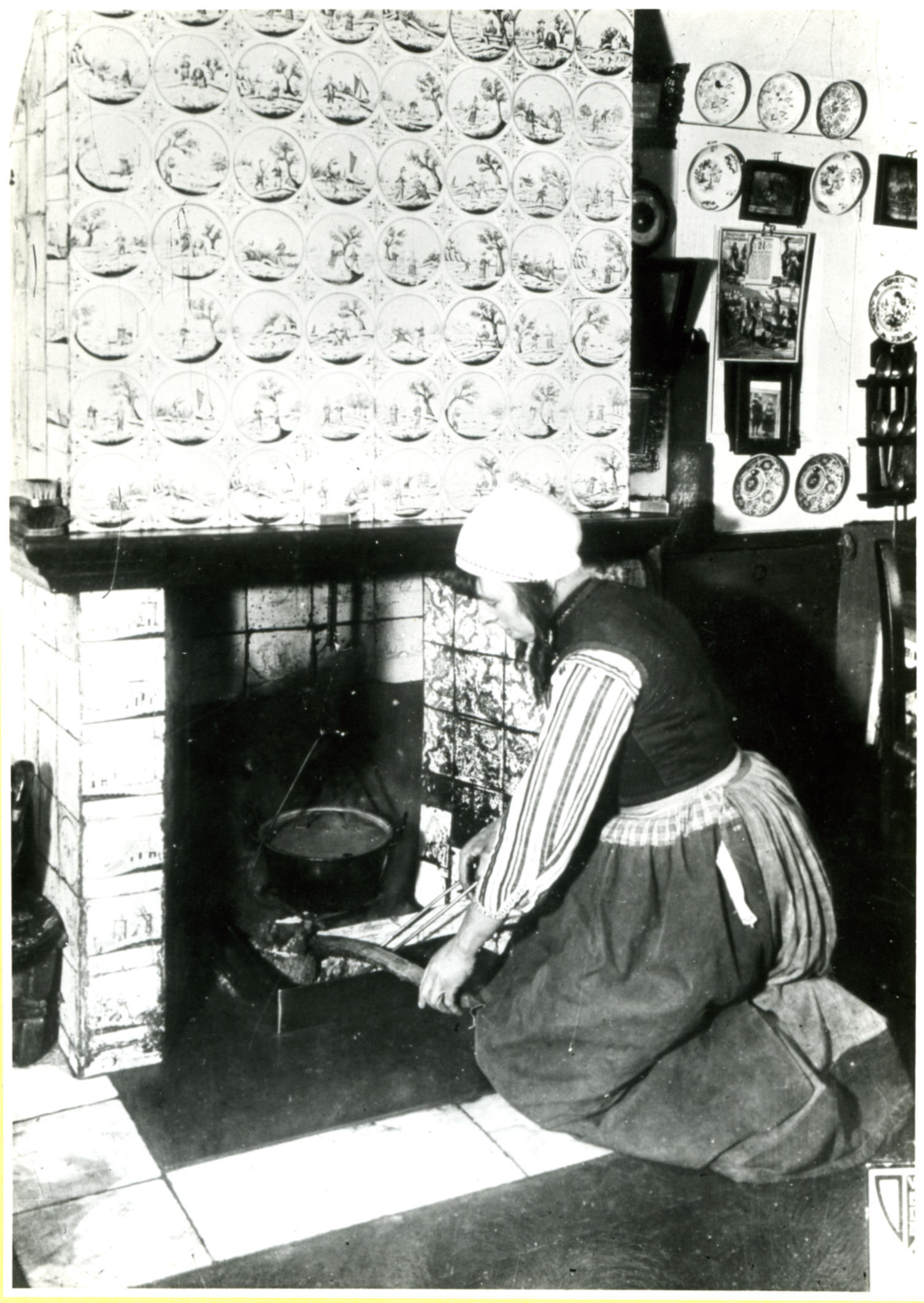 Vrouw in Marker streekdracht bij een betegelde schouw in een woning op Marken. Hier woonden Pieter van Altena ('Pieterniesie') en Grietje van Altena-Erf. Pieter en Grietje exploiteerden hun interieur al voor 1900 als 'kijkhuisje'. De activiteiten werden na hun beider dood voortgezet door hun dochter Grietje Kaars-van Altena (Grietje van Pieterniesie') en diens man Cornelis ...